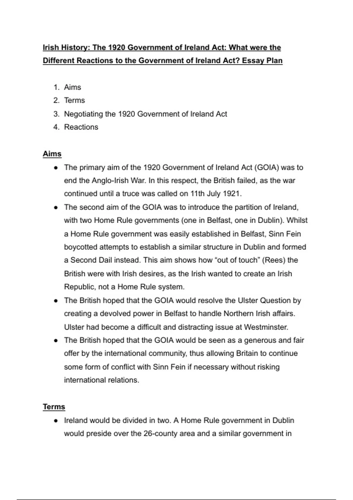 This document is an in-depth essay plan which analyses the 1920 Government of Ireland Act and the reactions which it provoked. Using this essay plan I received an A* on this topic. Happy studying!