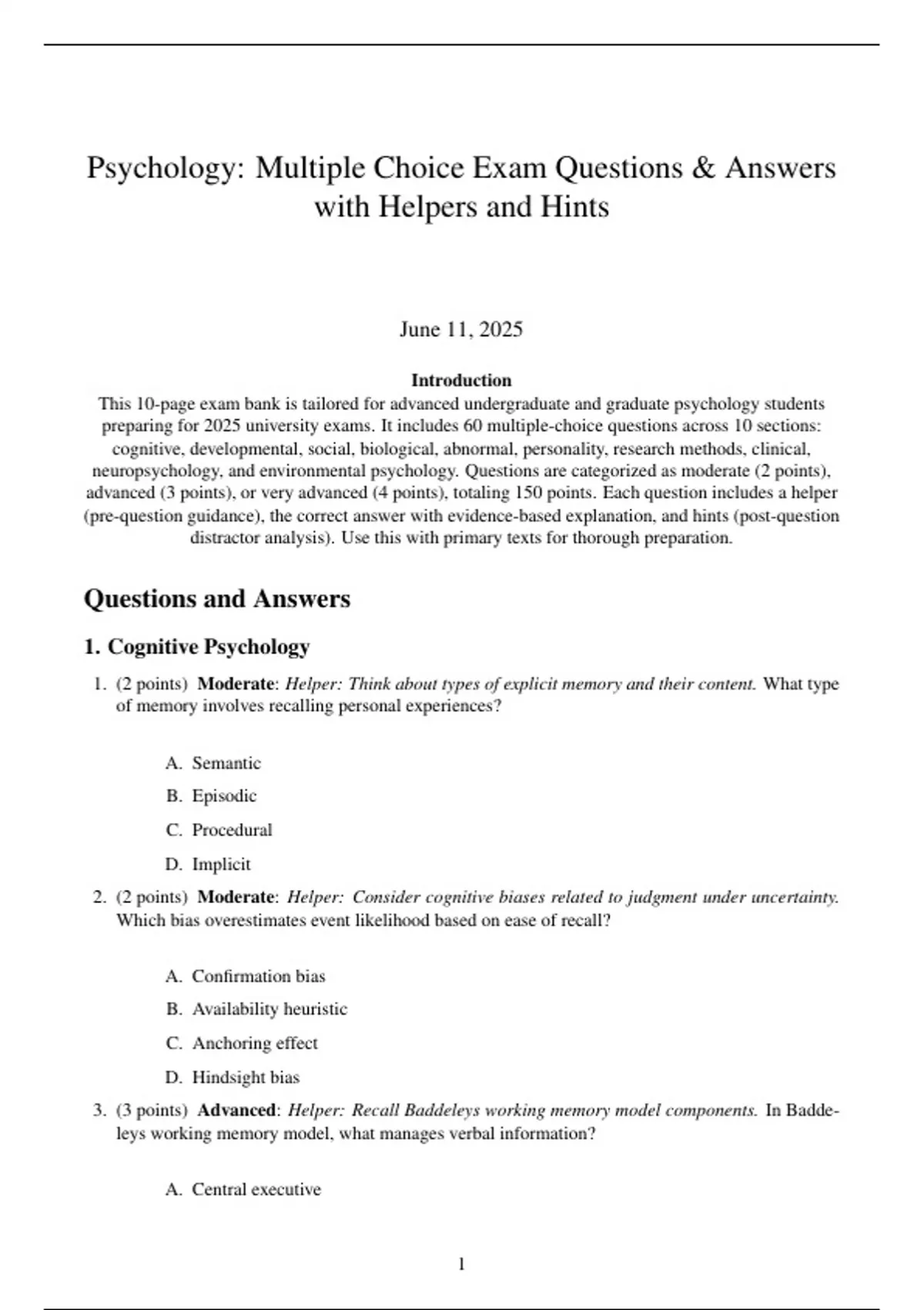 Psychology: Multiple Choice Exam Questions & Answers with Helpers and Hints June 11, 2025 Introduction This 10-page exam bank is tailored for advanced undergraduate and graduate psychology students preparing for 2025 university exams. It includes 60 multiple-choice questions across 10 sections: cognitive, developmental, social, biological, abnormal, personality, research methods, clinical, neuropsychology, and environmental psychology. Questions are categorized as moderate (2 points), advanced (3 points), or very advanced (4 points), totaling 150 points. Each question includes a helper (pre-question guidance), the correct answer with evidence-based explanation, and hints (p