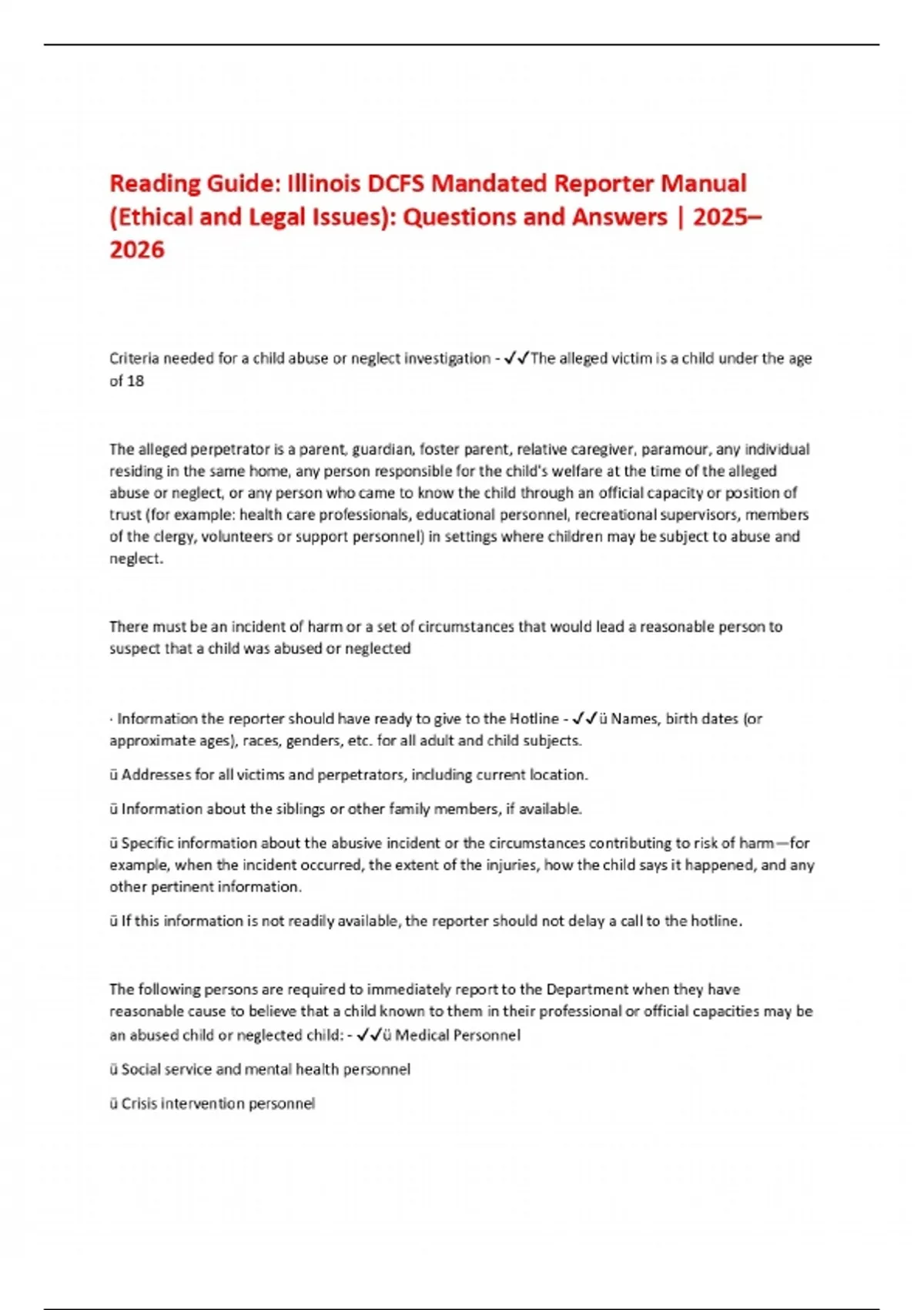 Reading Guide: Illinois DCFS Mandated Reporter Manual (Ethical and Legal Issues): Questions and Answers | 2025– 2026