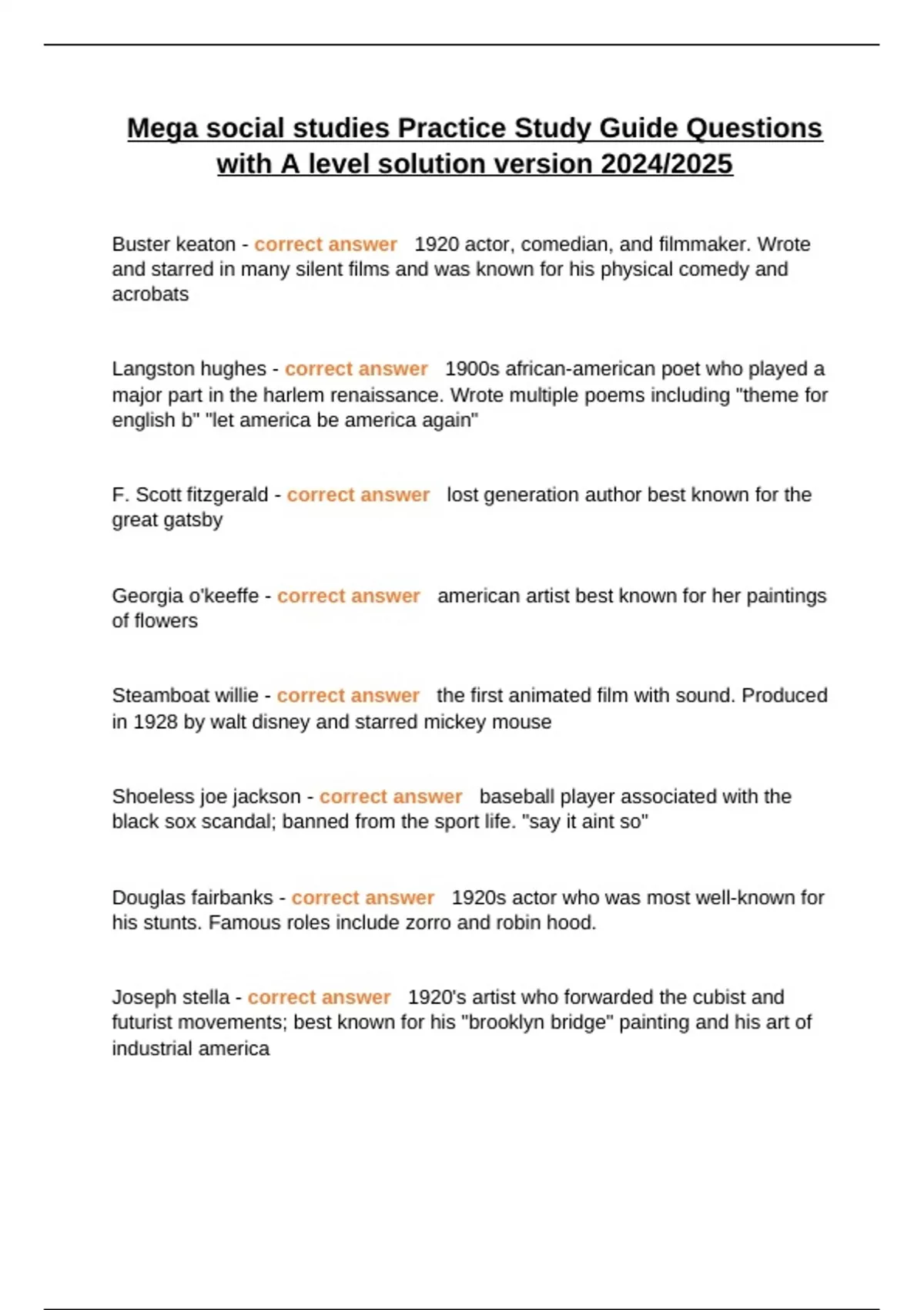 Buster keaton - correct answer 1920 actor, comedian, and filmmaker. Wrote and starred in many silent films and was known for his physical comedy and acrobats Langston hughes - correct answer 1900s african-american poet who played a major part in the harlem renaissance. Wrote multiple poems including "theme for english b" "let america be america again" F. Scott fitzgerald - correct answer lost generation author best known for the great gatsby Georgia o'keeffe - correct answer american artist best known for her paintings of flowers Steamboat willie - correct answer the first animated film with sound. Produced in 1928 by walt disney and starred mickey mouse Shoeless joe jackson - correct answer baseball player associated with the black sox scandal; banned from the sport life. "say it aint so" Douglas fairbanks - correct answer 1920s actor who was most well-known for his stunts. Famous roles include zorro and robin hood. Joseph stella - correct answer 1920's artist who forwarded the cubist and futurist movements; best known for his "brooklyn bridge" painting and his art of industrial america Norman rockwell - correct answer 1900's artist who sentimentally illustrated everyday rural life in america. Louis armstrong - correct answer 1900's trumpet player. Known for his raspy voice and jazz skill. "what a wonderful world" Rudolph valentino - correct answer 1920's actor who gained a nickname "the latin lover" for his romance portrayals in silent films Zora neale hurston - correct answer harlem renaissance poet best known for her poem "their eyes were watching god" Marcus garvey - correct answer african-american journalist who called for black schools and neighborhoods to have their own communities. Warren g harding - correct answer 29th president of the united states () known for filling his cabinet with his friends and for scandals like the teapot dome. "return to normalcy" died of heart attack while in office. Teapot dome - correct answer scandal committed during harding's presidency in which cabinet members took a bribe to allow civilians to drill on federal land.