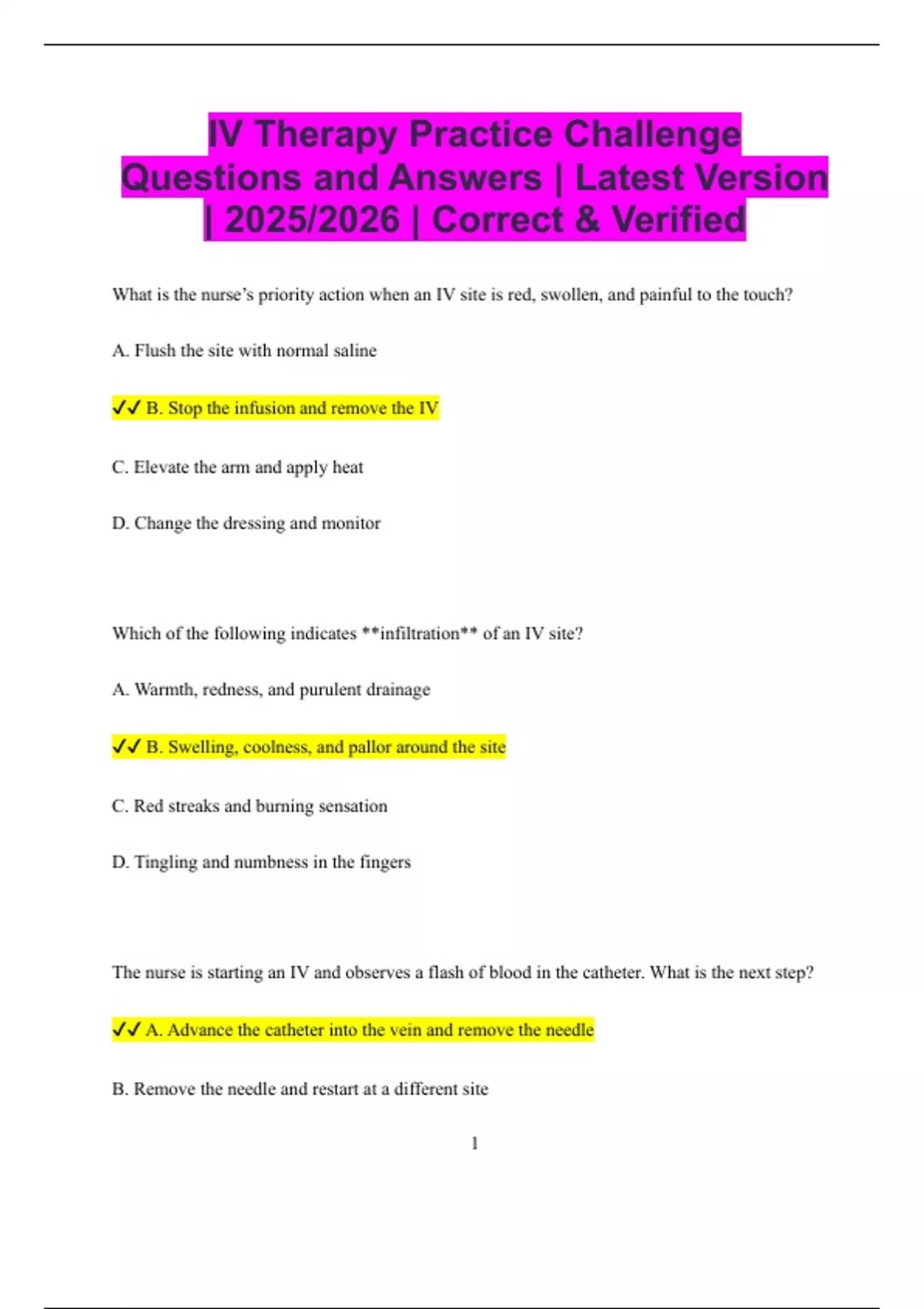 ✔✔ A. Advance the catheter into the vein and remove the needle
