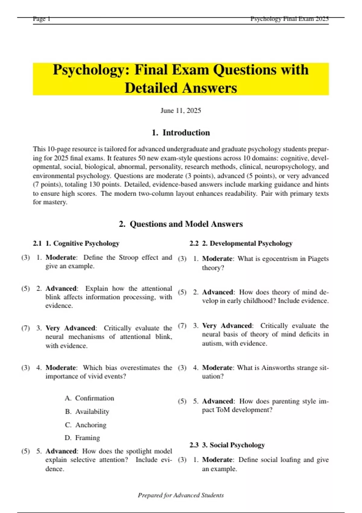 Psychology: Final Exam Questions with Detailed Answers June 11, 2025 1. Introduction This 10-page resource is tailored for advanced undergraduate and graduate psychology students preparing for 2025 final exams. It features 50 new exam-style questions across 10 domains: cognitive, developmental, social, biological, abnormal, personality, research methods, clinical, neuropsychology, and environmental psychology. Questions are moderate (3 points), advanced (5 points), or very advanced (7 points), totaling 130 points. Detailed, evidence-based answers include marking guidance and hints to ensure high scores. The modern two-column layout enhances readability. Pair with primary texts for mastery.