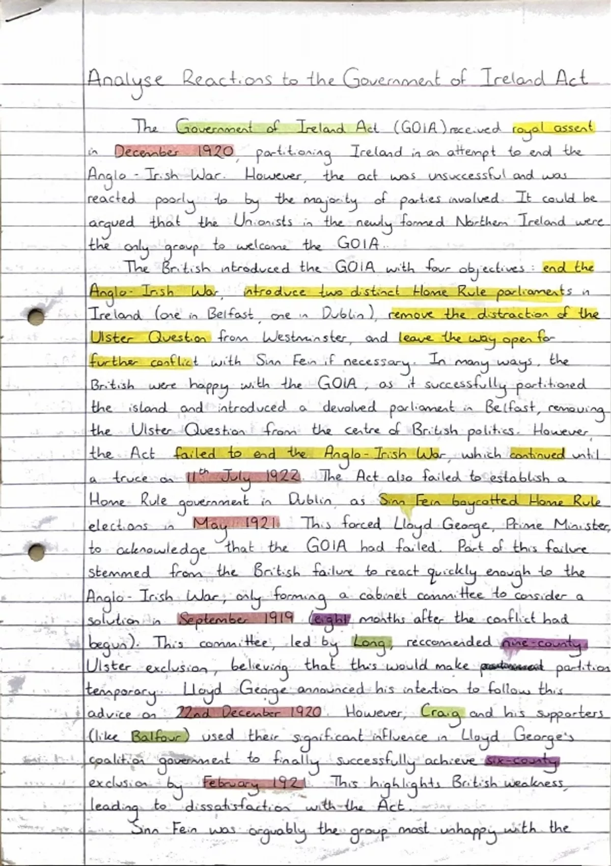 This essay analyses the successes, failures, and reactions of the 1920 Government of Ireland Act as part of A-Level History. Happy studying!