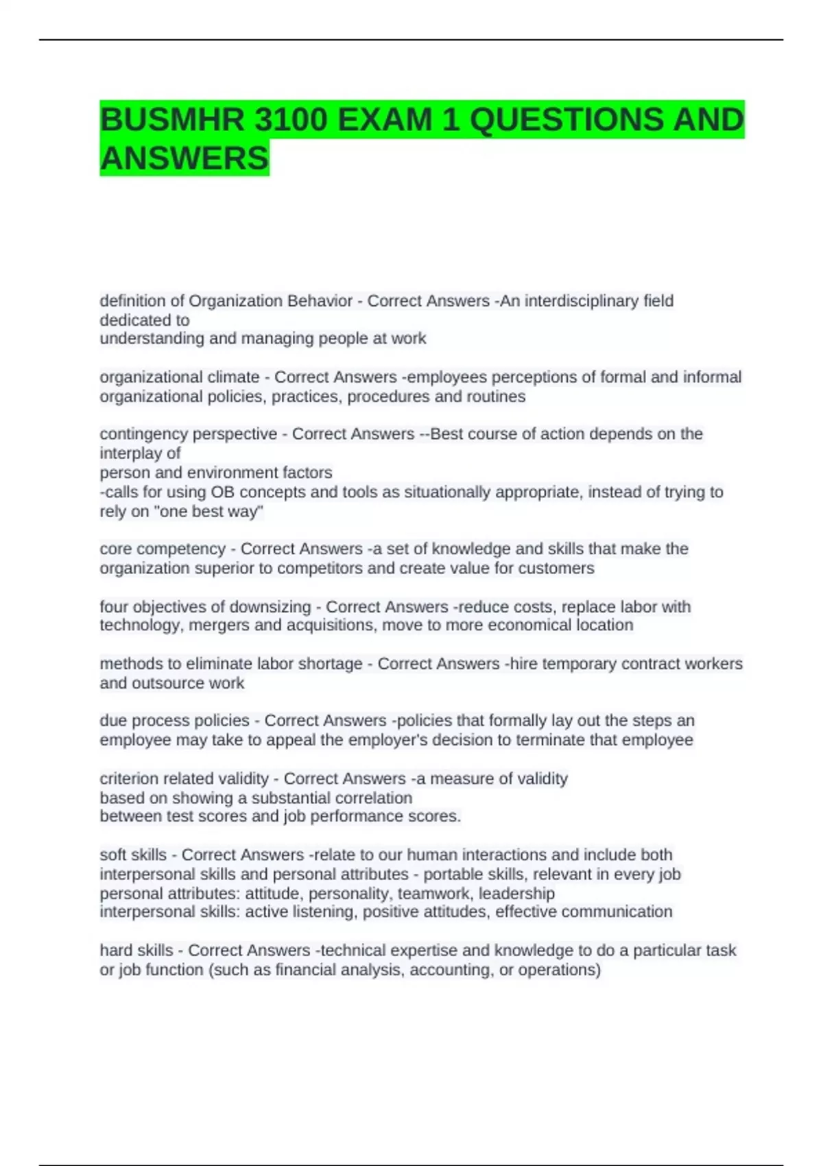 BUSMHR 3100 EXAM 1 QUESTIONS AND