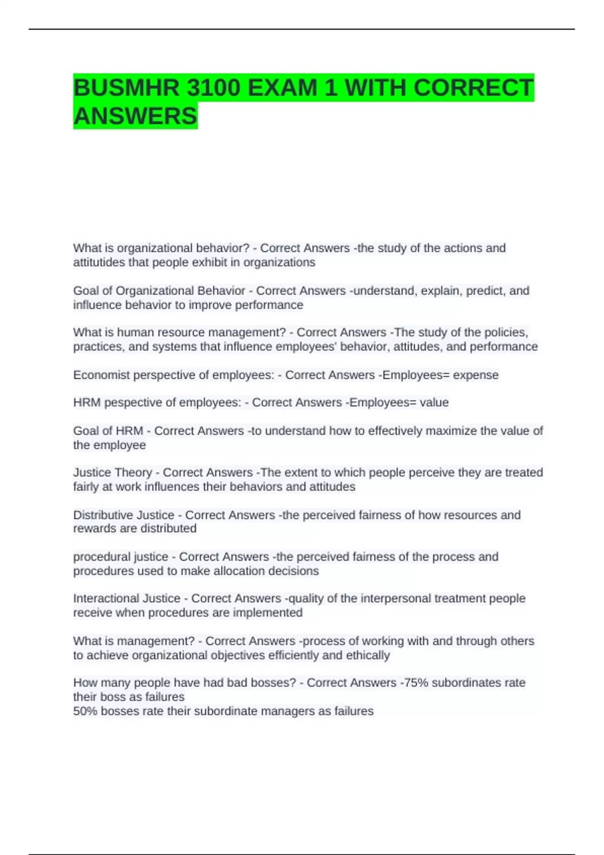 BUSMHR 3100 EXAM 1 WITH CORRECT