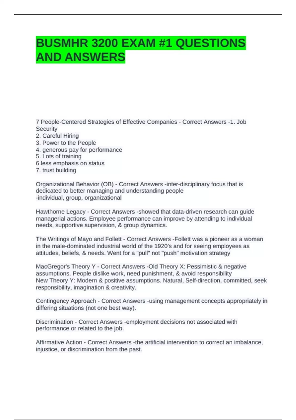 BUSMHR 3200 EXAM #1 QUESTIONS AND ANSWERS