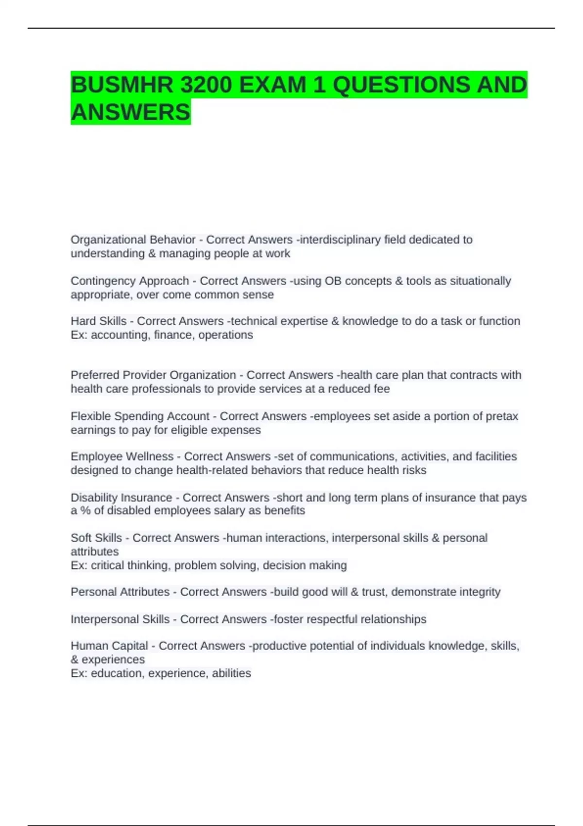 BUSMHR 3200 EXAM 1 QUESTIONS AND