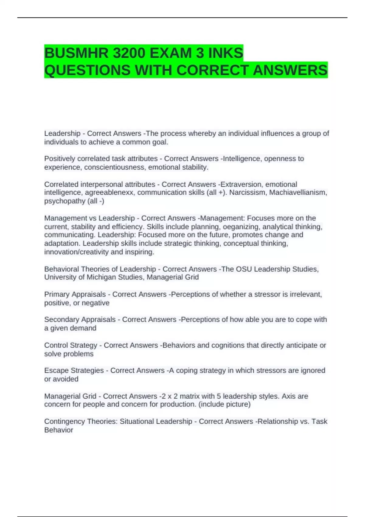 BUSMHR 3200 EXAM 3 INKS QUESTIONS WITH CORRECT ANSWERS