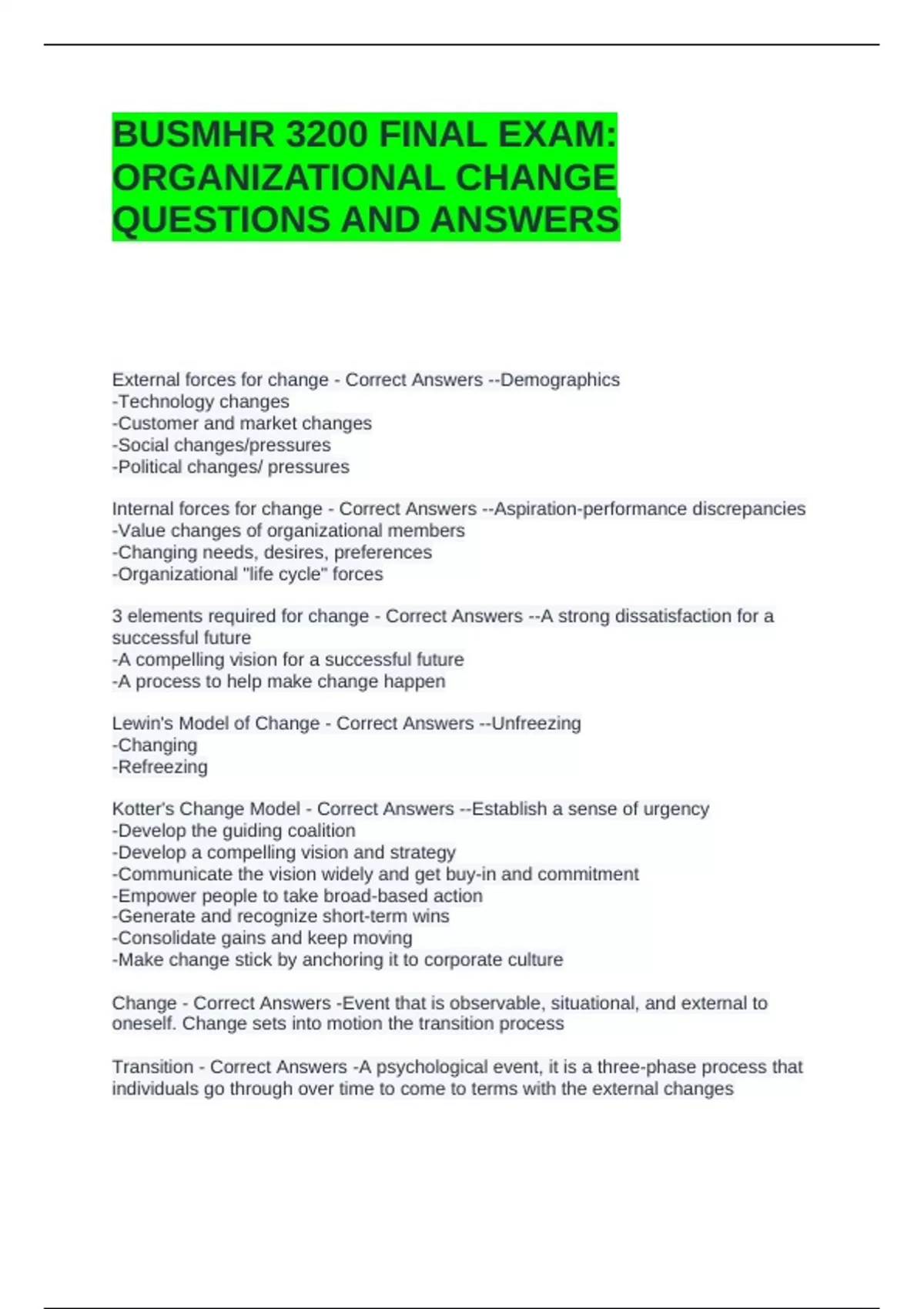 3 elements required for change - Correct Answers --A strong dissatisfaction for a