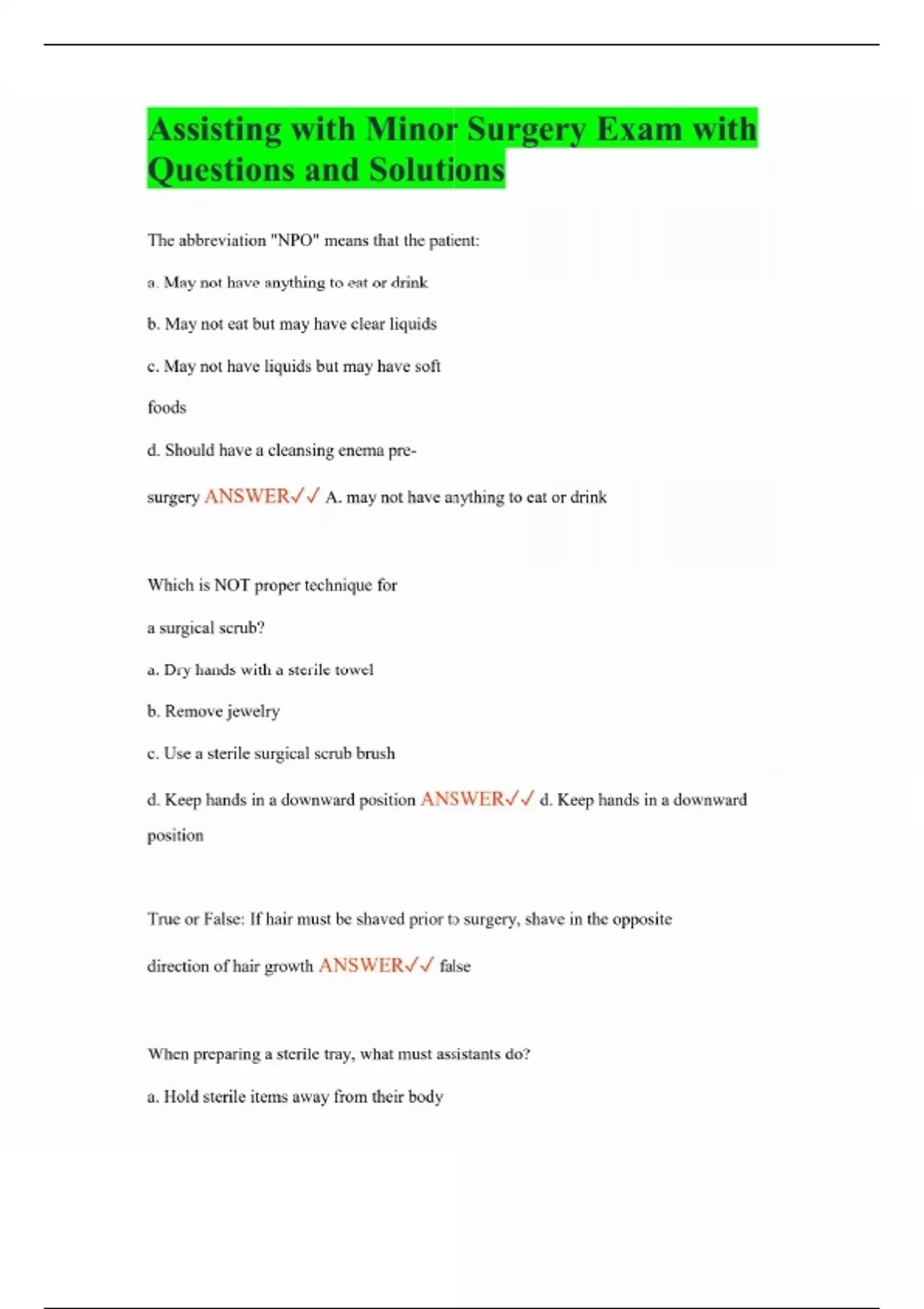 Assisting with Minor Surgery Exam with Questions and Solutions The abbreviation "NPO" means that the patient: a. May not have anything to eat or drink b. May not eat but may have clear liquids c. May not have liquids but may have soft foods d. Should have a cleansing enema pre- surgery ANSWER A. may not have anything to eat or drink Which is NOT proper technique for a surgical scrub? a. Dry hands with a sterile towel b. Remove jewelry c. Use a sterile surgical scrub brush d. Keep hands in a downward position ANSWER d. Keep hands in a downward position True or False: If hair must be shaved prior to surgery, shave in the opposite direction of hair growth ANSWER false When preparing a sterile tray, what must assistants do? a. Hold sterile items away from their body