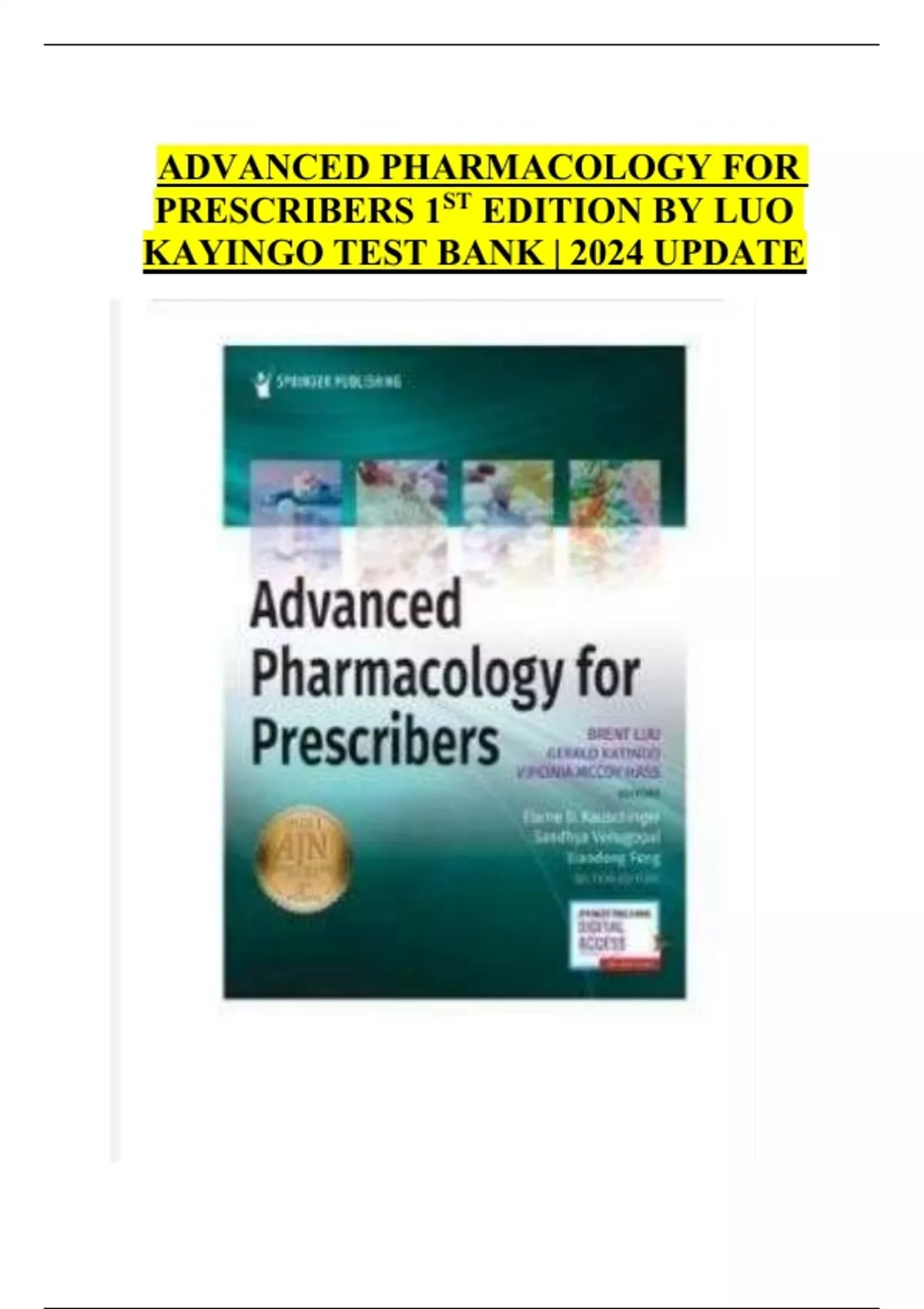 This document is a complete and updated 2024 test bank for Advanced Pharmacology for Prescribers by Luo Kayingo (1st Edition). It includes a wide range of multiple-choice questions with correct answers, covering all major topics such as pharmacokinetics, pharmacodynamics, drug classifications, and clinical application in prescribing. Ideal for exam preparation and aligned with current prescriber guidelines.