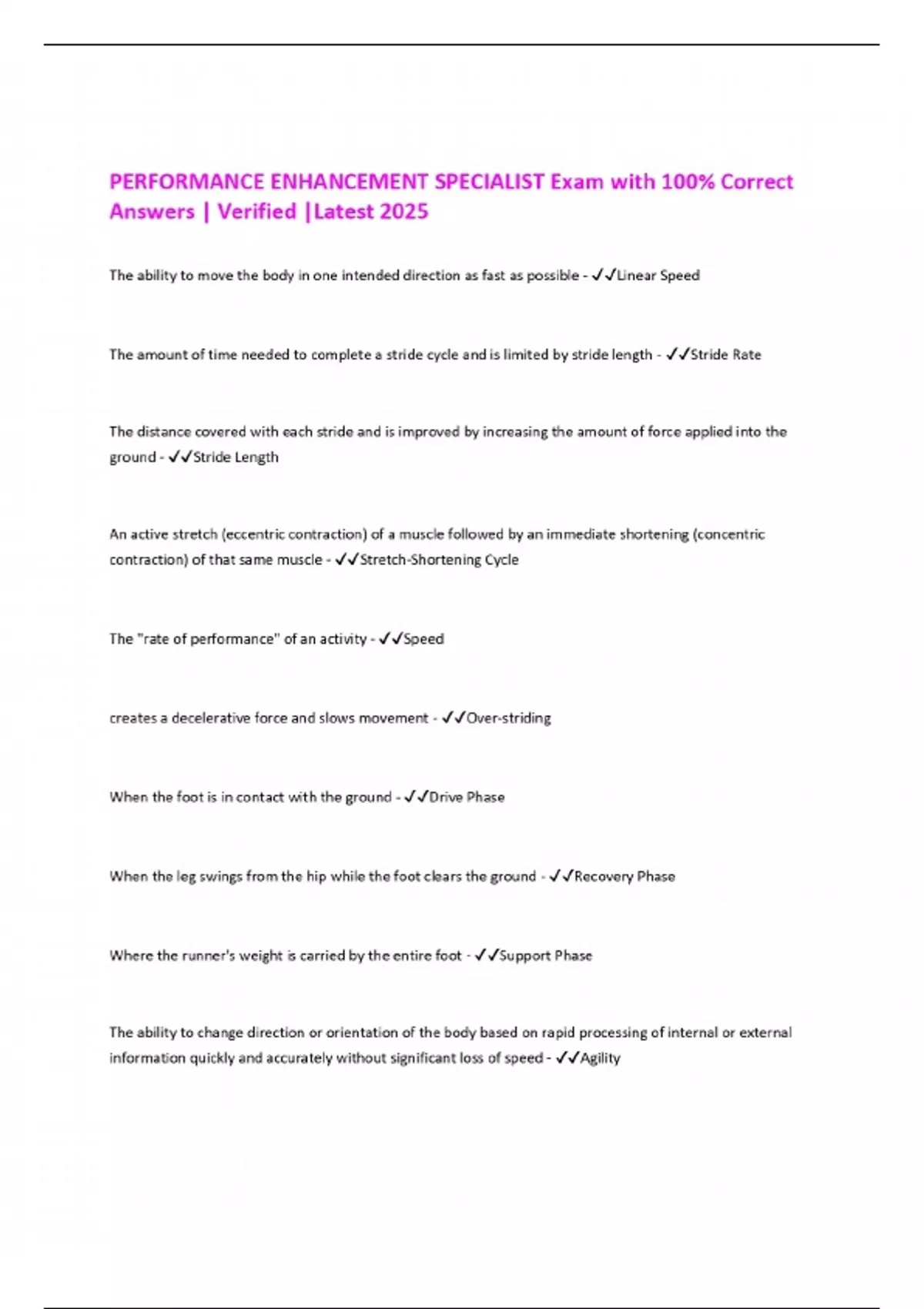 PERFORMANCE ENHANCEMENT SPECIALIST Exam with 100% Correct Answers | Verified |Latest 2025