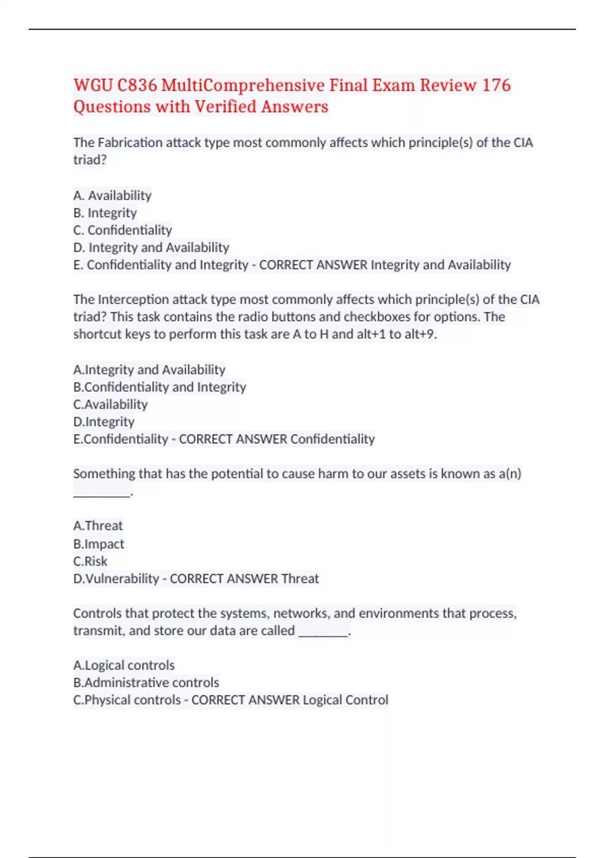 WGU C836 MultiComprehensive Final Exam Review 176 Questions with Verified Answers The Fabrication attack type most commonly affects which principle(s) of the CIA triad? A. Availability B. Integrity C. Confidentiality D. Integrity and Availability E. Confidentiality and Integrity - CORRECT ANSWER Integrity and Availability The Interception attack type most commonly affects which principle(s) of the CIA triad? This task contains the radio buttons and checkboxes for options. The shortcut keys to perform this task are A to H and alt+1 to alt+9. A.Integrity and Availability B.Confidentiality and Integrity C.Availability D.Integrity E.Confidentiality - CORRECT ANSWER Confidentiality Something that has the potential to cause harm to our assets is known as a(n) ________. A.Threat B.Impact C.Risk D.Vulnerability - CORRECT ANSWER Threat Controls that protect the systems, networks, and environments that process, transmit, and store our data are called _______. A.Logical controls B.Administrative controls C.Physical controls - CORRECT ANSWER Logical Control What is the first and arguably one of the most important steps of the risk management process? A.Assess risks B.Mitigate risks C.Identify threats D.Assess vulnerabilities E.Identify assets - CORRECT ANSWER Identify assets Protects information and information systems from unauthorized access, use, disclosure, disruption, modification, or destruction - CORRECT ANSWER information security A type of attack, primarily against confidentiality - CORRECT ANSWER Interception Something that has the potential to cause harm to our assets - CORRECT ANSWER Threat A weakness that can be used to harm us - CORRECT ANSWER Vulnerability The likelihood that something bad will happen - CORRECT ANSWER Risk An attack that involves tampering with our assets - CORRECT ANSWER Modification attack A model that adds three more principles to the CIA triad: possession or control, utility, and authenticity - CORRECT ANSWER Parkerian hexad The physical disposition of the media on which the data is stored - CORRECT ANSWER Possession or control An attack that involves generating data, processes, communications, or other similar activities with a system - CORRECT ANSWER Fabrication attack A multilayered defense that will allow us to achieve a successful defense should one or more of our defensive measures fail - CORRECT ANSWER Defense in depth Sometimes called technical controls, these protect the systems, networks, and environments that process, transmit, and store our data - CORRECT ANSWER Logical controls Controls that protect the physical environment in which our systems sit, or where our data is stored - CORRECT ANSWER Physical controls The risk management phase that consists of all of the activities that we can perform in advance of the incident itself, in order to better enable us to handle it - CORRECT ANSWER Preparation phase