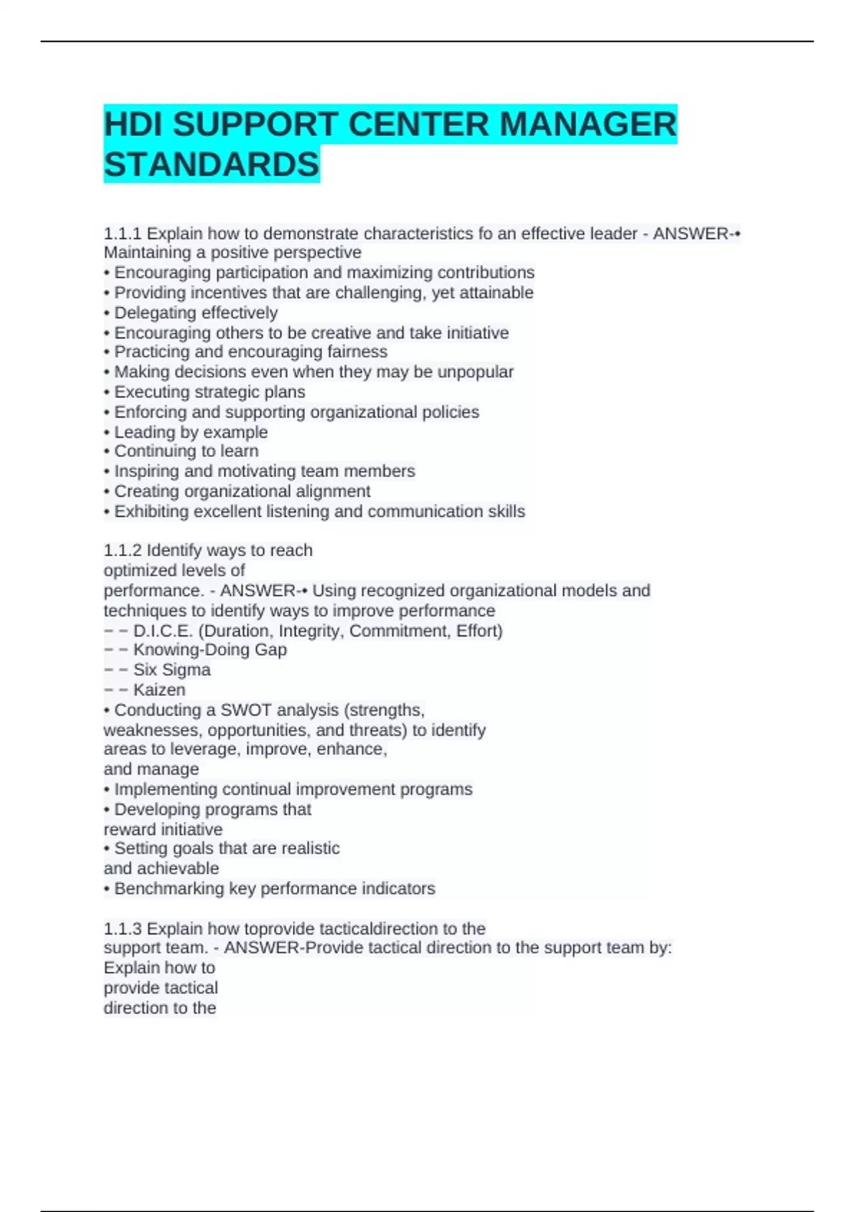 HDI SUPPORT CENTER MANAGER STANDARDSHDI SUPPORT CENTER MANAGER STANDARDS1.1.1 Explain how to demonstrate characteristics fo an effective leader - ANSWER-• Maintaining a positive perspective • Encouraging participation and maximizing contributions • Providing incentives that are challenging, yet attainable • Delegating effectively • Encouraging others to be creative and take initiative • Practicing and encouraging fairness • Making decisions even when they may be unpopular • Executing strategic plans • Enforcing and supporting organizational policies • Leading by example • Continuing to learn • Inspiring and motivating team members • Creating organizational alignment • Exhibiting excellent listening and communication skills 1.1.2 Identify ways to reach optimized levels of performance. - ANSWER-• Using recognized organizational models and techniques to identify ways to improve performance − − D.I.C.E. (Duration, Integrity, Commitment, Effort) − − Knowing-Doing Gap − − Six Sigma
