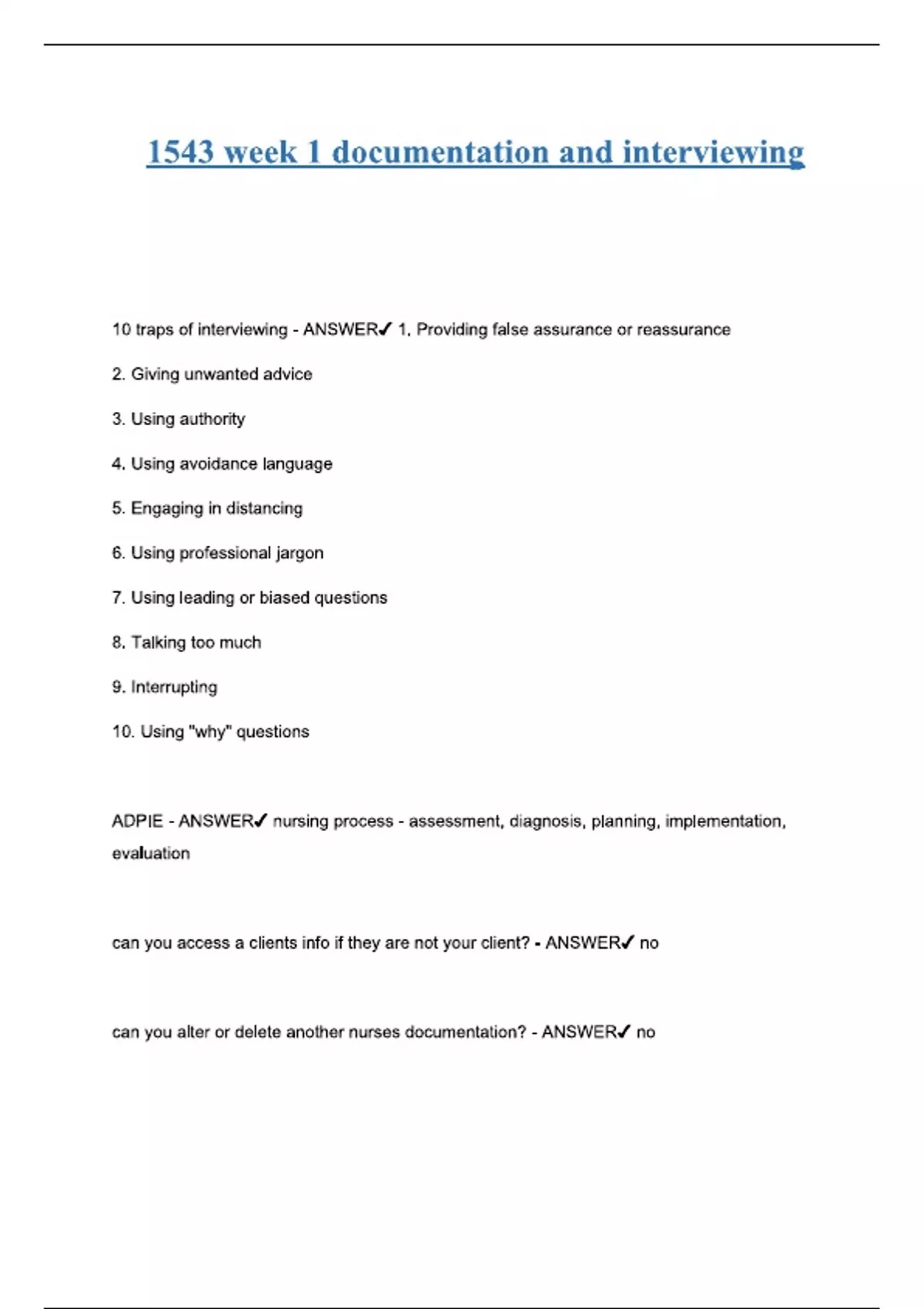 1543 week 1 documentation and interviewing Comprehensive questions and verified answers (100% correct) grade A+