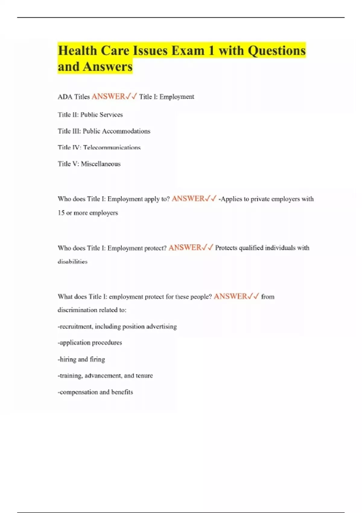 Health Care Issues Exam 1 with Questions and Answers ADA Titles ANSWER Title I: Employment Title II: Public Services Title III: Public Accommodations Title IV: Telecommunications Title V: Miscellaneous Who does Title I: Employment apply to? ANSWER -Applies to private employers with 15 or more employers Who does Title I: Employment protect? ANSWER Protects qualified individuals with disabilities What does Title I: employment protect for these people? ANSWER from discrimination related to: -recruitment, including position advertising -application procedures -hiring and firing -training, advancement, and tenure -compensation and benefits