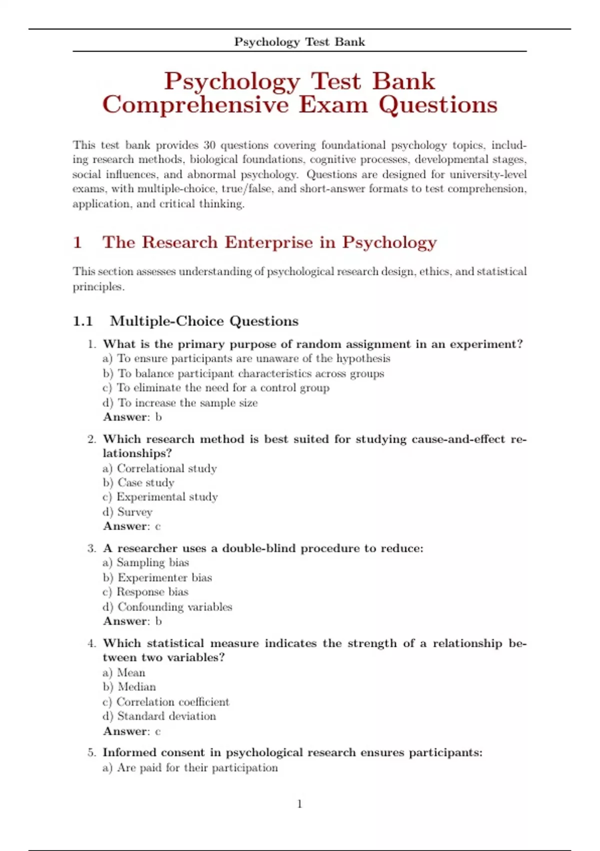 This test bank provides 30 questions covering foundational psychology topics, includ-