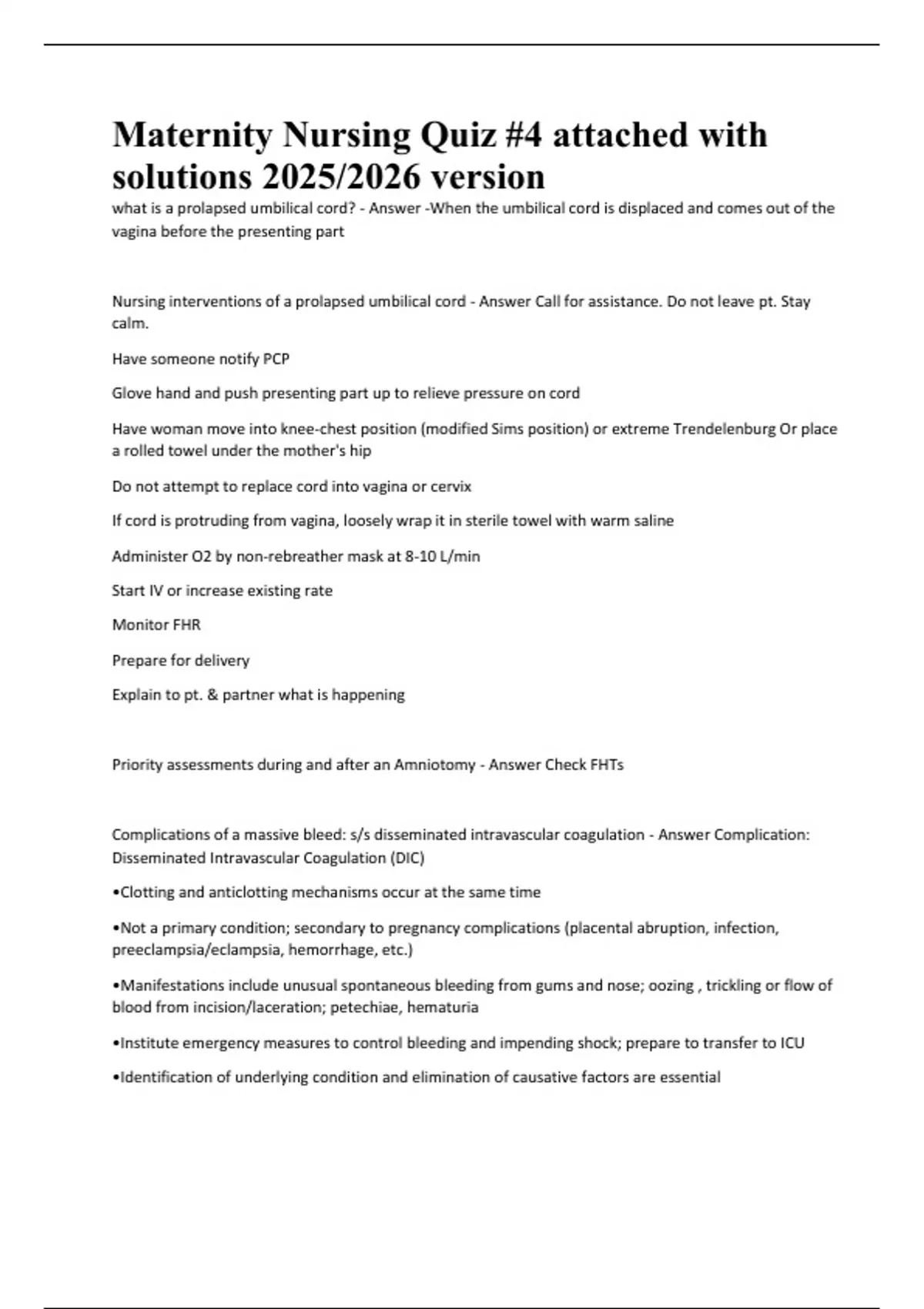 Nursing interventions of a prolapsed umbilical cord - Answer Call for assistance. Do not leave pt. Stay