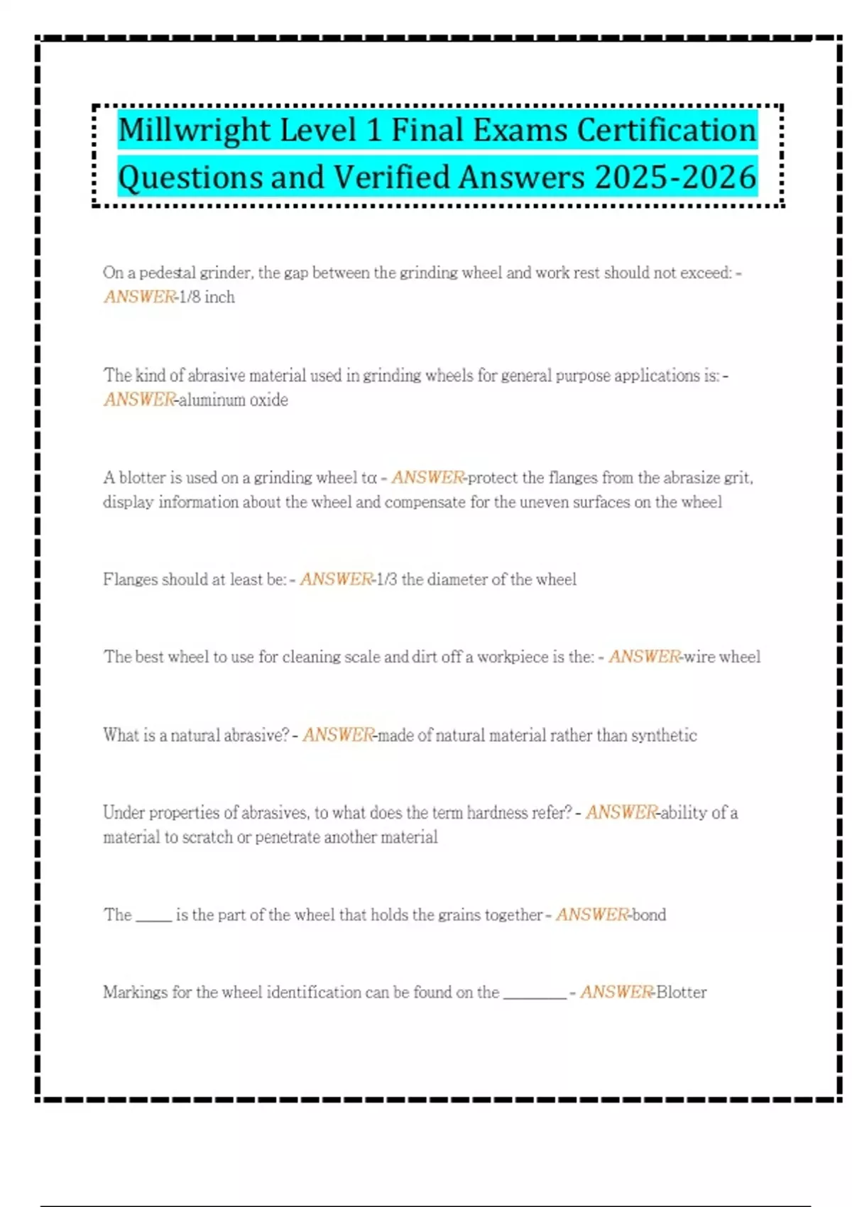 Millwright Level 1 Final Exams Certification Questions and Verified Answers