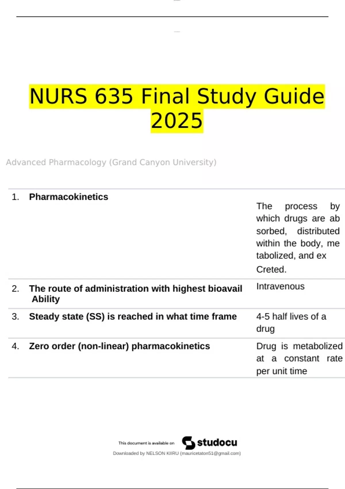 NURS 635 Final Study Guide 20251. Pharmacokinetics The process by which drugs are ab sorbed, distributed within the body, me tabolized, and ex Creted. 2. The route of administration with highest bioavail Ability Intravenous 3. Steady state (SS) is reached in what time frame 4-5 half lives of a drug 4. Zero order (non-linear) pharmacokinetics Drug is metabolized at a constant rate per unit time
