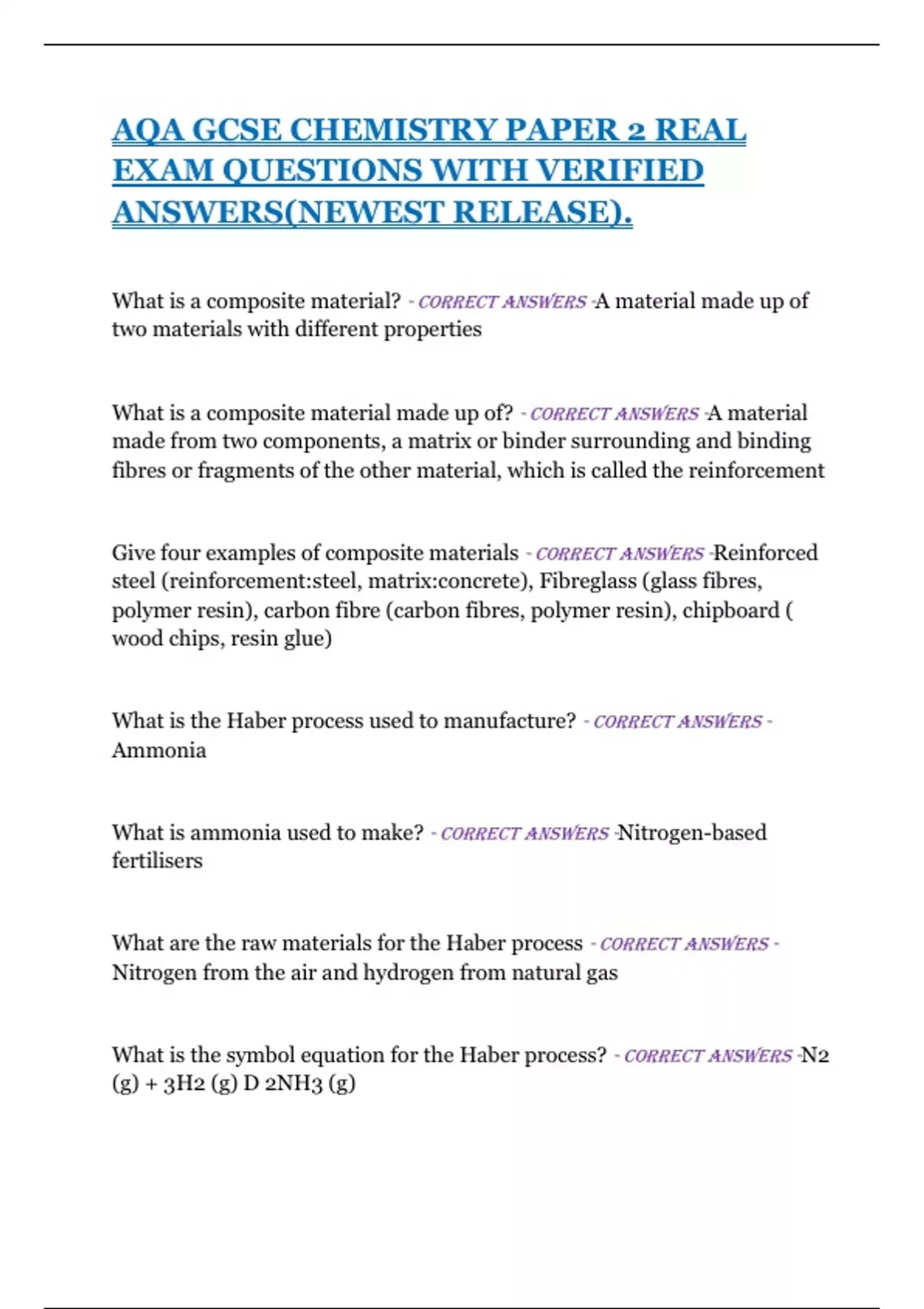 AQA GCSE CHEMISTRY PAPER 2 REAL EXAM QUESTIONS WITH VERIFIED ANSWERS(NEWEST RELEASE).