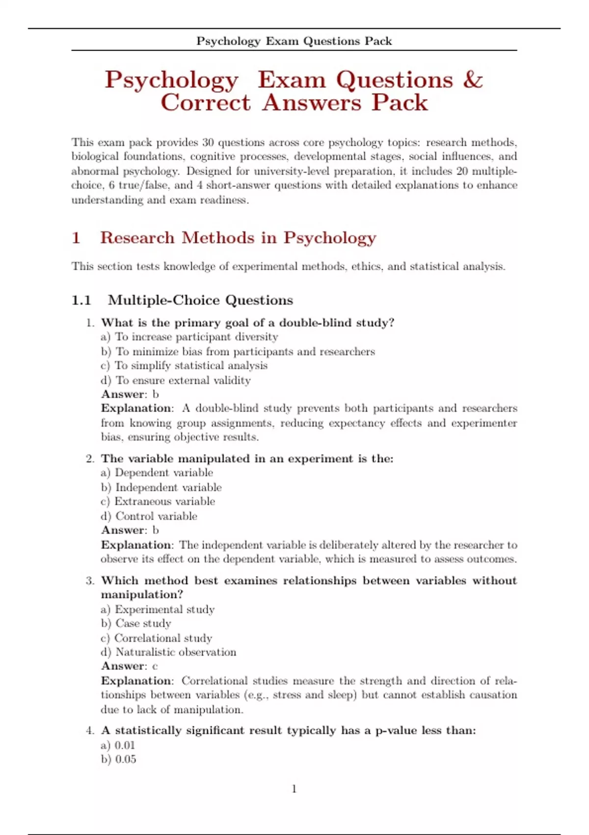 This exam pack provides 30 questions across core psychology topics: research methods,
