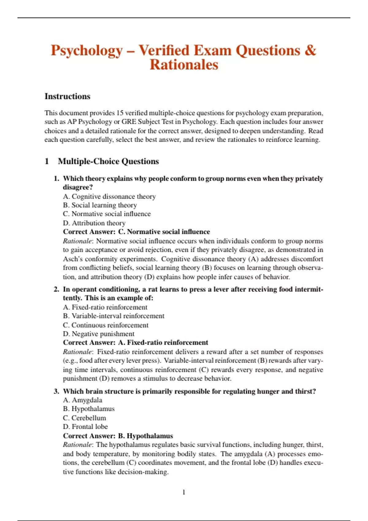 This document provides 15 verified multiple-choice questions for psychology exam preparation,