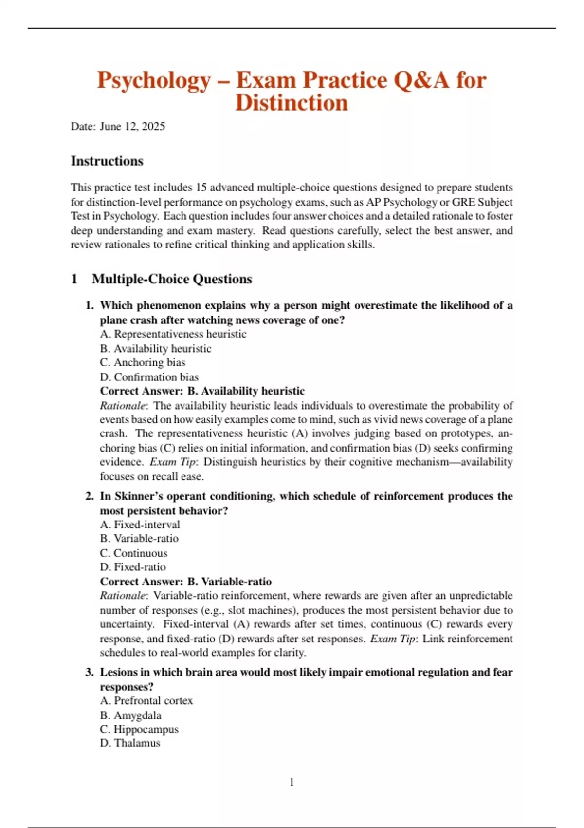 Test in Psychology. Each question includes four answer choices and a detailed rationale to foster