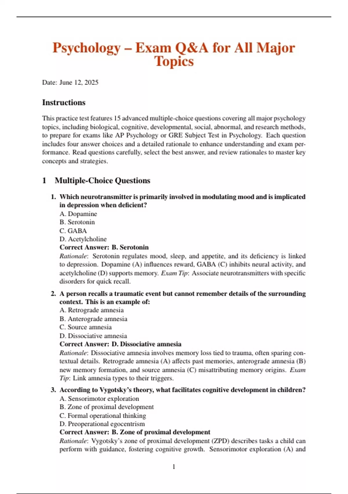 This practice test features 15 advanced multiple-choice questions covering all major psychology