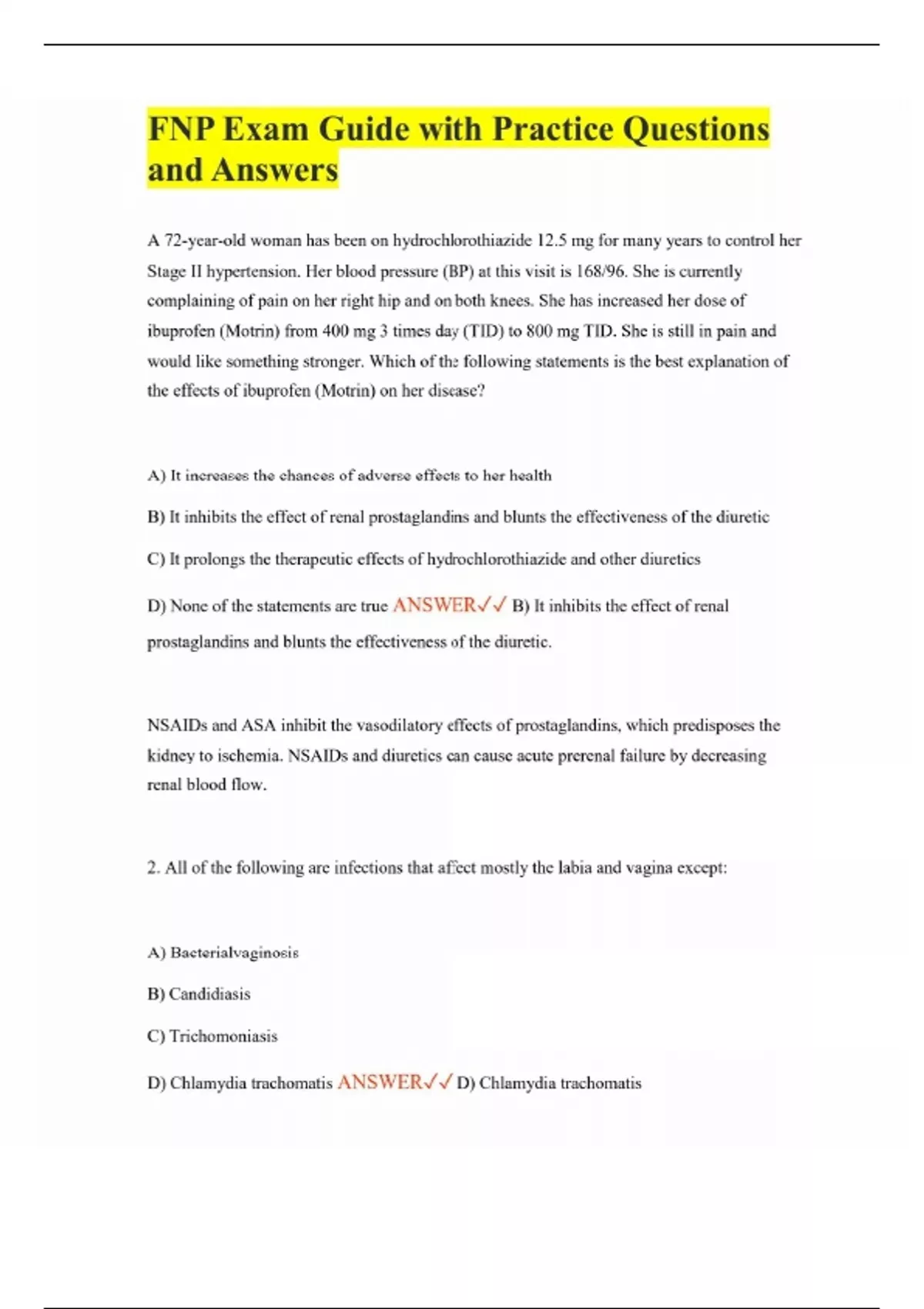 FNP Exam Guide with Practice Questions and Answers A 72-year-old woman has been on hydrochlorothiazide 12.5 mg for many years to control her Stage II hypertension. Her blood pressure (BP) at this visit is 168/96. She is currently complaining of pain on her right hip and on both knees. She has increased her dose of ibuprofen (Motrin) from 400 mg 3 times day (TID) to 800 mg TID. She is still in pain and would like something stronger. Which of the following statements is the best explanation of the effects of ibuprofen (Motrin) on her disease? A) It increases the chances of adverse effects to her health B) It inhibits the effect of renal prostaglandins and blunts the effectiveness of the diuretic C) It prolongs the therapeutic effects of hydrochlorothiazide and other diuretics D) None of the statements are true ANSWER B) It inhibits the effect of renal prostaglandins and blunts the effectiveness of the diuretic. NSAIDs and ASA inhibit the vasodilatory effects of prostaglandins, which predisposes the kidney to ischemia. NSAIDs and diuretics can cause acute prerenal failure by decreasing renal blood flow. 2. All of the following are infections that affect mostly the labia and vagina except: A) Bacterialvaginosis B) Candidiasis C) Trichomoniasis D) Chlamydia trachomatis ANSWER D) Chlamydia trachomatis