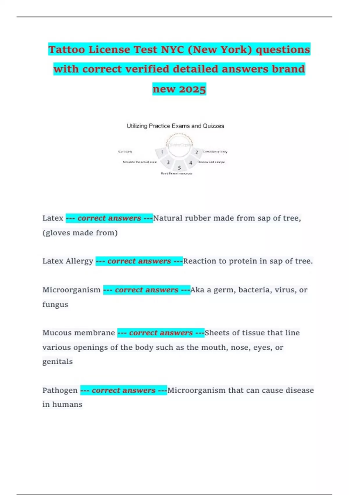 Tattoo License Test NYC (New York) questions with correct verified detailed answers brand new 2025 Latex --- correct answers ---Natural rubber made from sap of tree, (gloves made from) Latex Allergy --- correct answers ---Reaction to protein in sap of tree. Microorganism --- correct answers ---Aka a germ, bacteria, virus, or fungus Mucous membrane --- correct answers ---Sheets of tissue that line various openings of the body such as the mouth, nose, eyes, or genitals