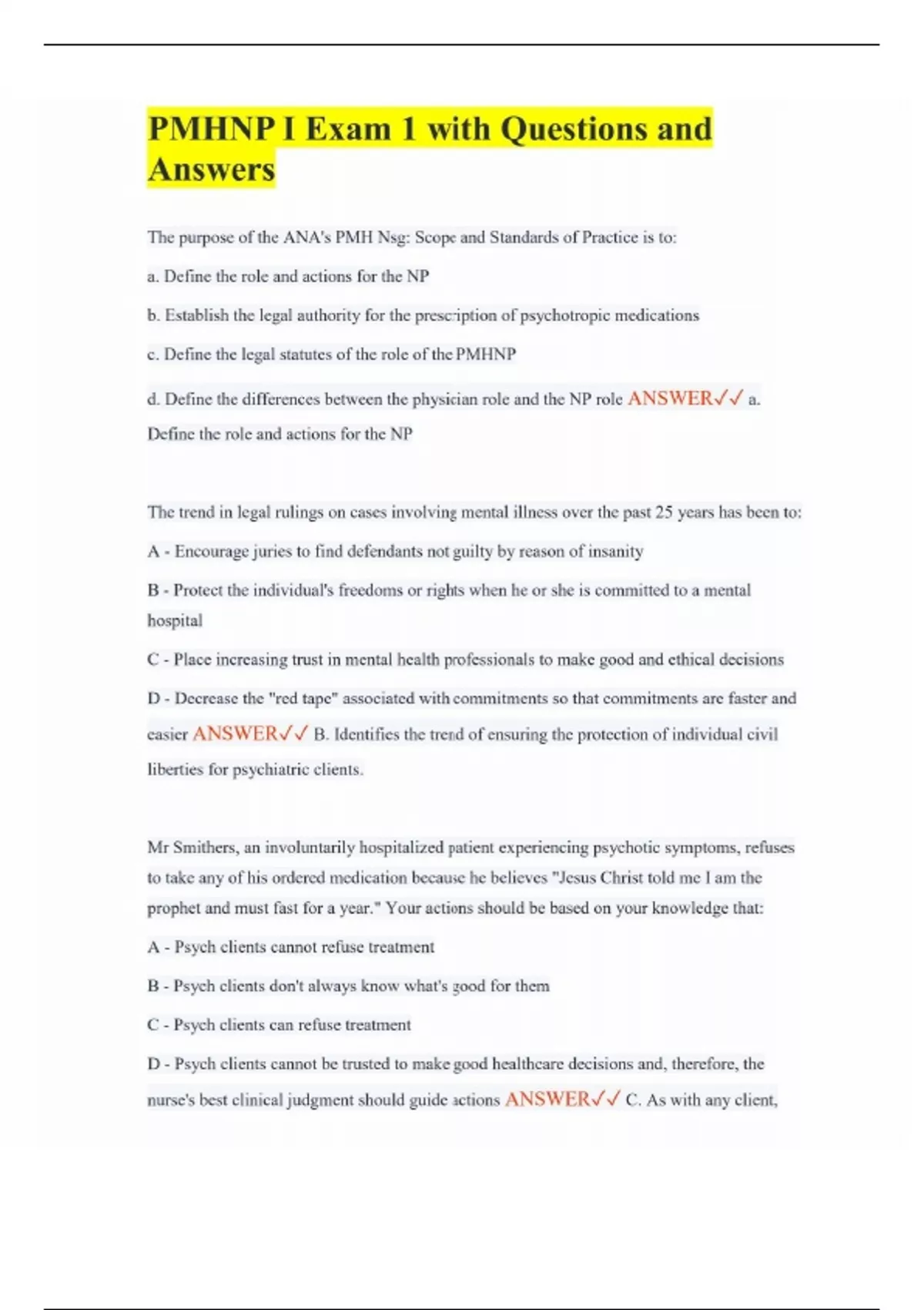 PMHNP I Exam 1 with Questions and Answers The purpose of the ANA's PMH Nsg: Scope and Standards of Practice is to: a. Define the role and actions for the NP b. Establish the legal authority for the prescription of psychotropic medications c. Define the legal statutes of the role of the PMHNP d. Define the differences between the physician role and the NP role ANSWER a. Define the role and actions for the NP The trend in legal rulings on cases involving mental illness over the past 25 years has been to: A - Encourage juries to find defendants not guilty by reason of insanity B - Protect the individual's freedoms or rights when he or she is committed to a mental hospital C - Place increasing trust in mental health professionals to make good and ethical decisions D - Decrease the "red tape" associated with commitments so that commitments are faster and easier ANSWER B. Identifies the trend of ensuring the protection of individual civil liberties for psychiatric clients. Mr Smithers, an involuntarily hospitalized patient experiencing psychotic symptoms, refuses to take any of his ordered medication because he believes "Jesus Christ told me I am the prophet and must fast for a year." Your actions should be based on your knowledge that: A - Psych clients cannot refuse treatment B - Psych clients don't always know what's good for them C - Psych clients can refuse treatment D - Psych clients cannot be trusted to make good healthcare decisions and, therefore, the nurse's best clinical judgment should guide actions ANSWER C. As with any client,