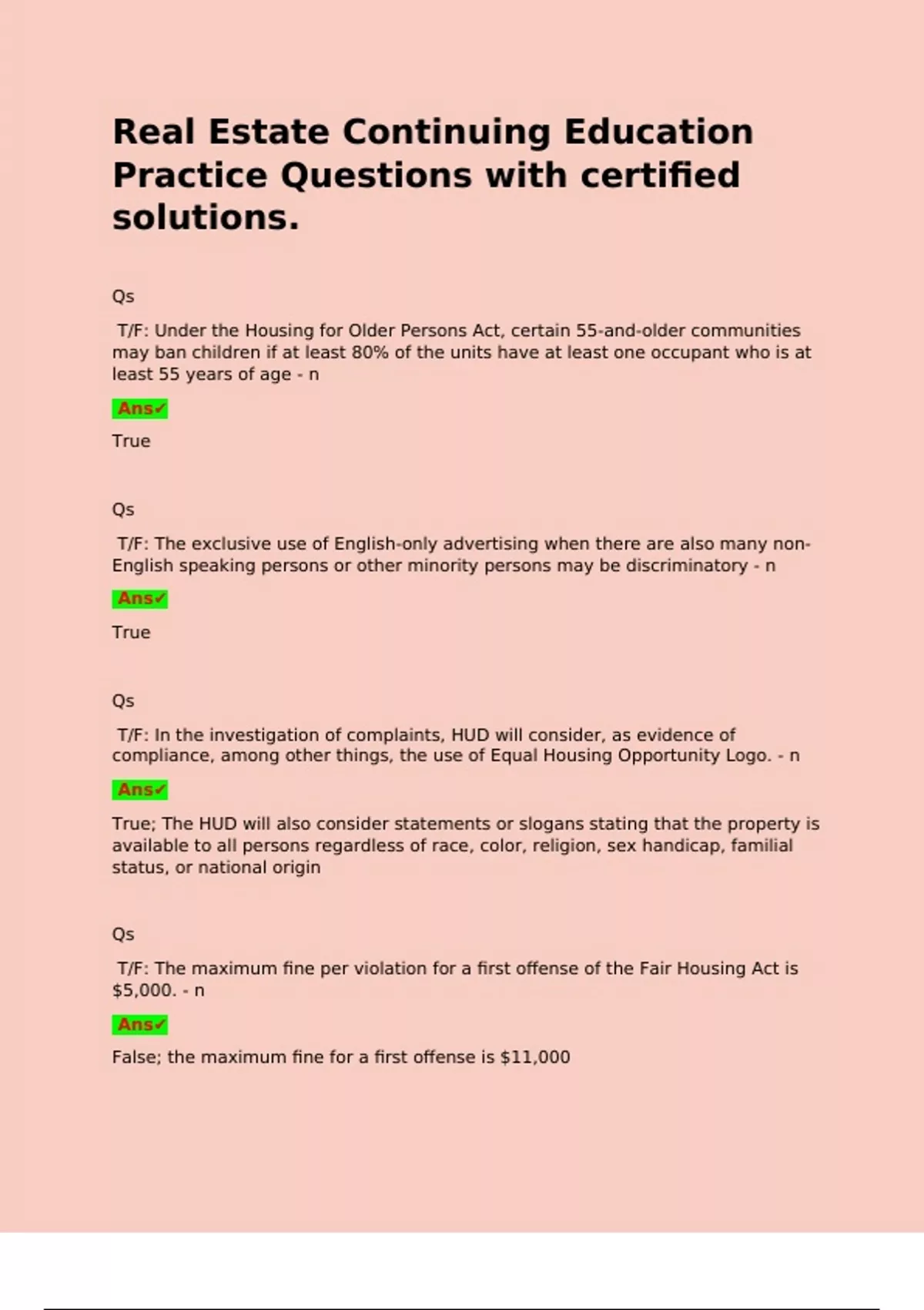 Real Estate Continuing Education Practice Questions with certified solutions. Qs T/F: Under the Housing for Older Persons Act, certain 55-and-older communities may ban children if at least 80% of the units have at least one occupant who is at least 55 years of age - n Ans True Qs T/F: The exclusive use of English-only advertising when there are also many non-English speaking persons or other minority persons may be discriminatory - n Ans True Qs T/F: In the investigation of complaints, HUD will consider, as evidence of compliance, among other things, the use of Equal Housing Opportunity Logo. - n Ans