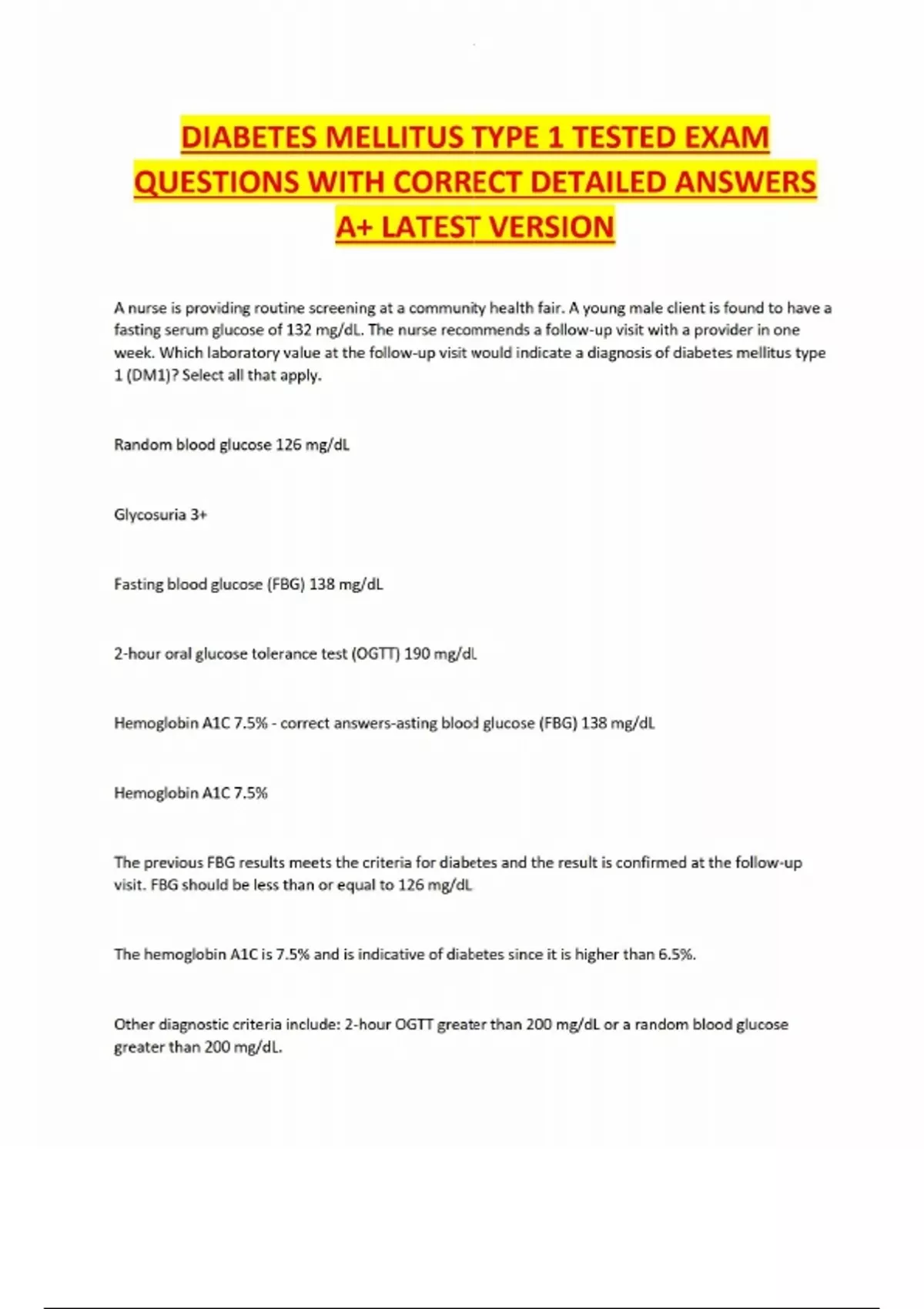 DIABETES MELLITUS TYPE 1 TESTED EXAM QUESTIONS WITH CORRECT DETAILED ANSWERS A+ LATEST VERSION A nurse is providing routine screening at a community health fair. A young male client is found to have a fasting serum glucose of 132 mg/dL. The nurse recommends a follow-up visit with a provider in one week. Which laboratory value at the follow-up visit would indicate a diagnosis of diabetes mellitus type 1 (DM1)? Select all that apply. Random blood glucose 126 mg/dL Glycosuria 3+ Fasting blood glucose (FBG) 138 mg/dL