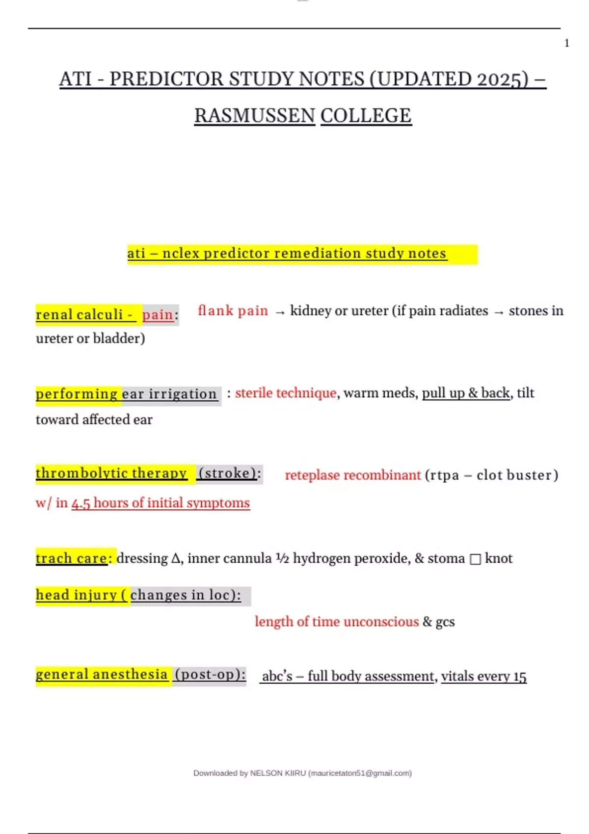ati – nclex predictor remediation study notes flank pain → kidney or ureter (if pain radiates → stones in renal calculi - pain: ureter or bladder) : sterile technique, warm meds, pull up & back, tilt performing ear irrigation toward affected ear thrombolytic therapy (stroke): reteplase recombinant (rtpa – clot buster) head injury ( changes in loc): w/ in 4.5 hours of initial symptoms trach care: dressing ∆, inner cannula ½ hydrogen peroxide, & stoma □ knot length of time unconscious & gcs