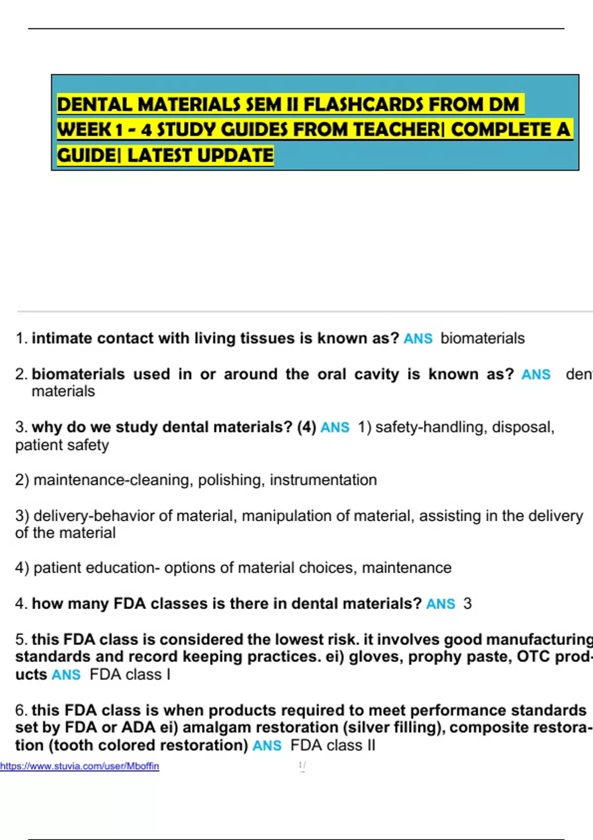 DENTAL MATERIALS SEM II FLASHCARDS FROM DM WEEK 1 - 4 STUDY GUIDES FROM TEACHER| COMPLETE A GUIDE| LATEST UPDATE 1. intimate contact with living tissues is known as? ANS biomaterials 2. biomaterials used in or around the oral cavity is known as? ANS dental materials 3. why do we study dental materials? (4) ANS 1) safety-handling, disposal, patient safety 2) maintenance-cleaning, polishing, instrumentation 3) delivery-behavior of material, manipulation of material, assisting in the delivery of the material 4) patient education- options of material choices, maintenance 4. how many FDA classes is there in dental materials? ANS 3 5. this FDA class is considered the lowest risk. it involves good manufacturing standards and record keeping practices. ei) gloves, prophy paste, OTC prod- ucts ANS FDA class I 6. this FDA class is when products required to meet performance standards set by FDA or ADA ei) amalgam restoration (silver filling), composite restora- tion (tooth colored restoration) ANS FDA class II