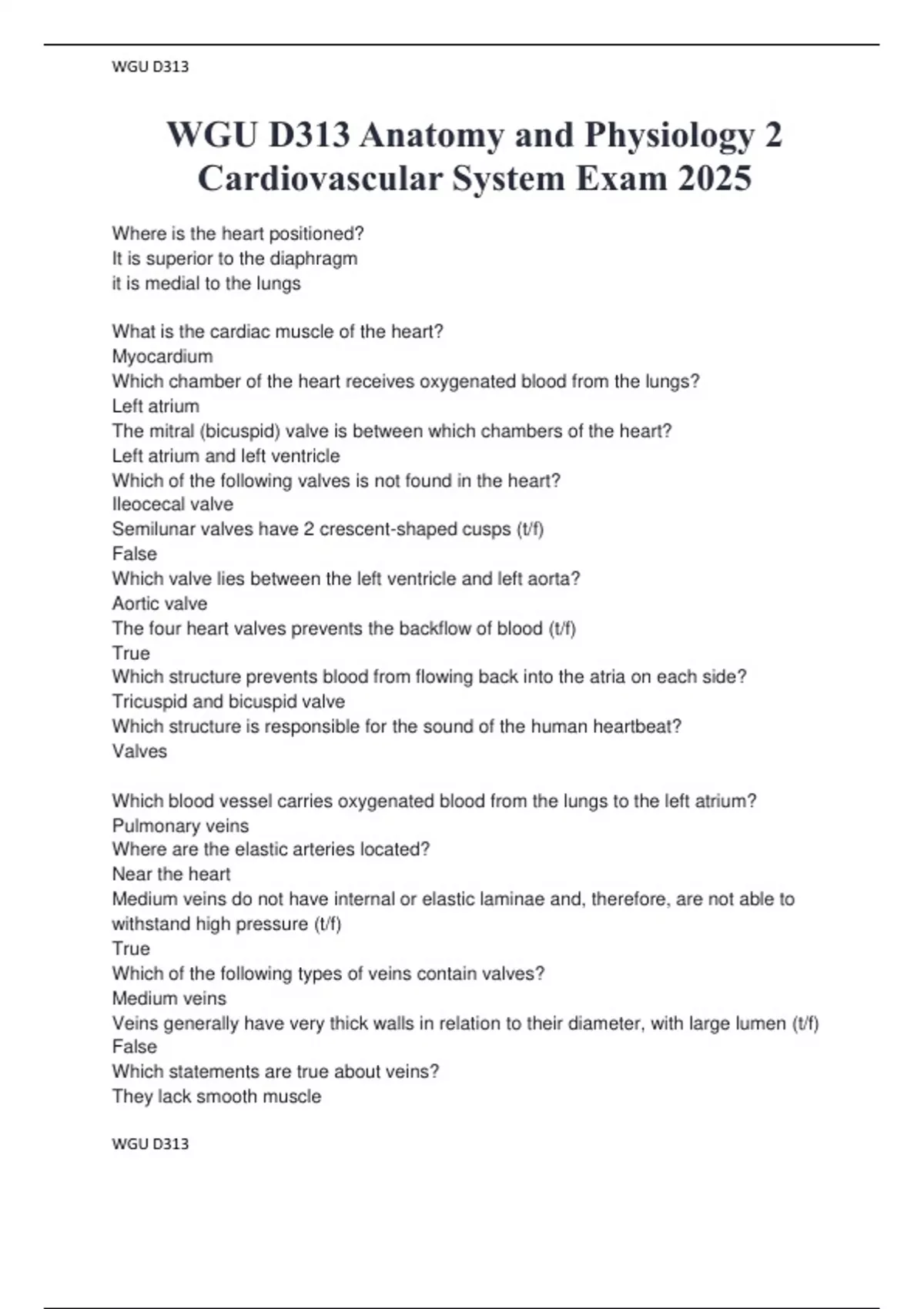 WGU D313 Anatomy and Physiology 2 Cardiovascular System Exam 2025