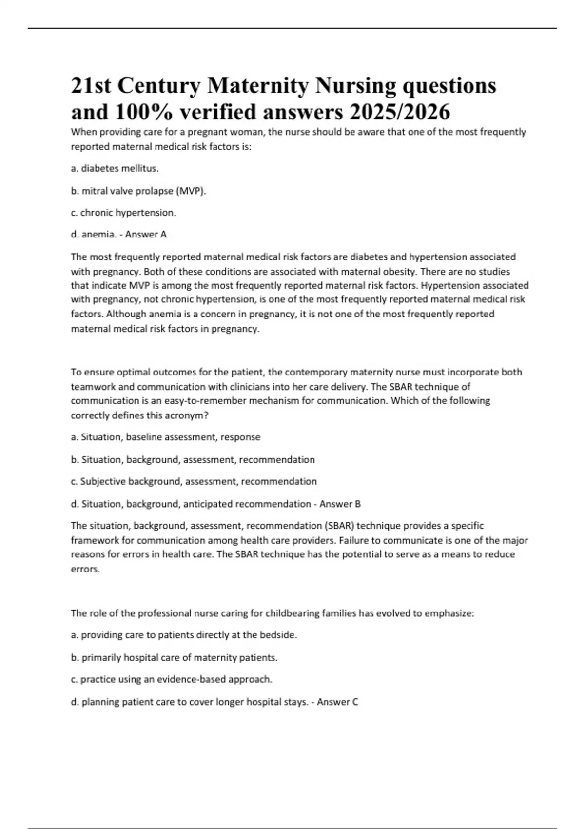 Stay ahead in maternal–newborn care with this cutting‑edge review guide featuring 100 fully verified NCLEX‑style questions and concise rationales based on current best practices. Tailored for the 2025/2026 academic year, this PDF covers: Modern Maternal Risk Factors: diabetes, hypertension, obesity Evidence‑Based Communication: SBAR technique for safe handoffs Cultural Competence & Health Literacy: strategies for diverse populations Access & Advocacy: overcoming financial, social, and systemic barriers Legal & Ethical Foundations: accountability, standards of care, confidentiality Integrative & Alternative Therapies: holistic approaches in maternity nursing Quality & Safety Initiatives: “Do Not Use” abbreviations, safe‑practice checklists Public Health Trends: U.S. birth rates, Healthy People 2020 outcomes, disparities Ideal for NCLEX‑RN/PN prep, HESI and ATI exam review, or as a high‑yield study companion in maternal–newborn and women’s health courses. 21st Century Maternity Nursing questions and 100% verified answers 2025/2026 When providing care for a pregnant woman, the nurse should be aware that one of the most frequently reported maternal medical risk factors is: a. diabetes mellitus. b. mitral valve prolapse (MVP). c. chronic hypertension. d. anemia. - Answer A The most frequently reported maternal medical risk factors are diabetes and hypertension associated with pregnancy. Both of these conditions are associated with maternal obesity. There are no studies that indicate MVP is among the most frequently reported maternal risk factors. Hypertension associated with pregnancy, not chronic hypertension, is one of the most frequently reported maternal medical risk factors. Although anemia is a concern in pregnancy, it is not one of the most frequently reported maternal medical risk factors in pregnancy. To ensure optimal outcomes for the patient, the contemporary maternity nurse must incorporate both teamwork and communication with clinicians into her care delivery. The SBAR technique of communication is an easy-to-remember mechanism for communication. Which of the following correctly defines this acronym? a. Situation, baseline assessment, response b. Situation, background, assessment, recommendation c. Subjective background, assessment, recommendation d. Situation, background, anticipated recommendation - Answer B The situation, background, assessment, recommendation (SBAR) technique provides a specific framework for communication among health care providers. Failure to communicate is one of the major reasons for errors in health care. The SBAR technique has the potential to serve as a means to reduce errors. The role of the professional nurse caring for childbearing families has evolved to emphasize: a. providing care to patients directly at the bedside. b. primarily hospital care of maternity patients. c. practice using an evidence-based approach. d. planning patient care to cover longer hospital stays. - Answer C Professional nurses are part of the team of health care providers who collabo