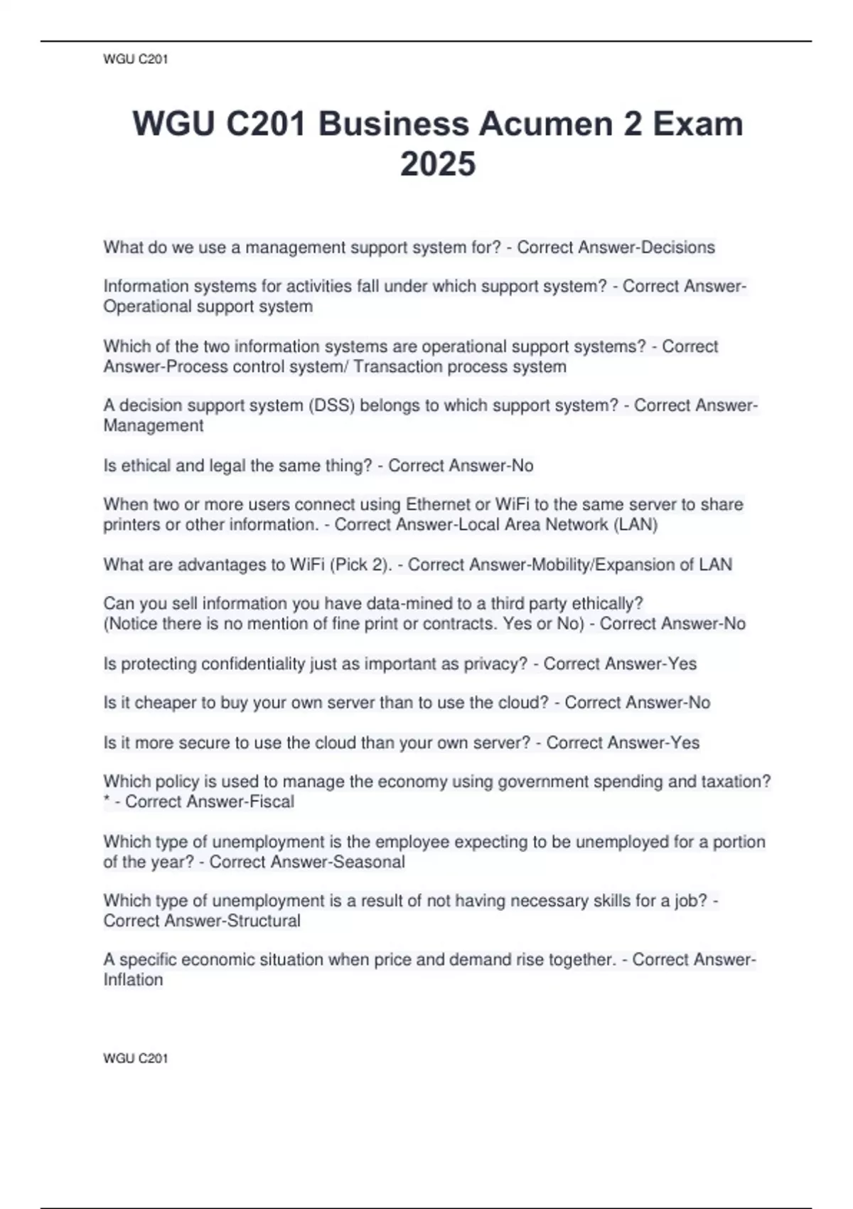 What do we use a management support system for? - Correct Answer-Decisions Information systems for activities fall under which support system? - Correct Answer Operational support system Which of the two information systems are operational support systems? - Correct Answer-Process control system/ Transaction process system A decision support system (DSS) belongs to which support system? - Correct Answer Management Is ethical and legal the same thing? - Correct Answer-No When two or more users connect using Ethernet or WiFi to the same server to share printers or other information. - Correct Answer-Local Area Network (LAN) What are advantages to WiFi (Pick 2). - Correct Answer-Mobility/Expansion of LAN Can you sell information you have data-mined to a third party ethically? (Notice there is no mention of fine print or contracts. Yes or No) - Correct Answer-No Is protecting confidentiality just as important as privacy? - Correct Answer-Yes Is it cheaper to buy your own server than to use the cloud? - Correct Answer-No Is it more secure to use the cloud than your own server? - Correct Answer-Yes Which policy is used to manage the economy using government spending and taxation? * - Correct Answer-Fiscal Which type of unemployment is the employee expecting to be unemployed for a portion of the year? - Correct Answer-Seasonal Which type of unemployment is a result of not having necessary skills for a job? - Correct Answer-Structural A specific economic situation when price and demand rise together. - Correct Answer Inflation WGU C201 WGU C201 As a business, is it best to reduce spending or increase spending in a high-inflation environment? - Correct Answer-Reduce As a business, which environment is best to make capital improvements? - Correct Answer-Low-inflation Which type of competition requires government regulation for entry? - Correct Answer Monopoly Which type of competition is the easiest to enter? - Correct Answer-Pure What is the name of the graph that we use to demonstrate demand? - Correct Answer Demand Curve What is the point where supply and demand curves intersect? - Correct Answer Equilibrium price When a tariff is increased on importing produce, is that micro or macro? - Correct Answer-Macro When Federal taxes are reduced, is that micro or macro? - Correct Answer-Macro Is the study of supply and demand a micro or macroeconomic issue? - Correct Answer Micro The coordination of all promotional activities—media advertising, direct mail, personal selling, sales promotion, and public relations—to produce a unified, customer-focused message. - Correct Answer-Integrated marketing communications Used in the growth and maturity stage of the product life cycle to improve competitive status of a product - Correct Answer-Persuasive advertising Compares products directly with their competitors either by name or by inference - Correct Answer-Comparative advertising Advertising to maintain awareness of the importance and usefulness of a product - Correct Answer-Reminder-oriented Concentrating marketing efforts on the product (features, quality, value), distribution, and promotional elements of the marketing mix. - Correct Answer-Competitive Pricing Companies promote the product to members of the marketing channel, not to end users - Correct Answer-Pushing Strategy WGU C201 WGU C201 Potential buyers will request that their suppliers—retailers or local distributors—carry the product, thereby pulling it through the distribution channel. - Correct Answer-Pulling Strategy Select the 3 different product types from the list below - Correct Answer-Specialty, Shopping, Convenience Which of the following product types is purchased most infrequently? - Correct Answer Specialty What is the third of the four stages of the product life cycle? - Correct Answer-Maturity Which stage of the product life cycle requires focusing on attracting the competition's customers? - Correct Answer-Maturity Does the marketing strategy change between the growth and maturity stages? - Correct Answer-Yes Marketing intermediaries do not add value to the product. - Correct Answer-False A price to a consumer can be cheaper if a wholesaler is used. - Correct Answer-True Which of the following are marketing intermediaries? - Correct Answer Wholesaler/Retailer/Broker Connecting the brand to a positive image (Ex: GE to eco-friendly) - Correct Answer Brand association Connecting the brand to the product. (Ex: Coffee to Maxwell House) - Correct Answer Brand Awareness Brand preference is a higher form of brand loyalty than brand recognition. - Correct Answer-True The highest form of brand loyalty is: - Correct Answer-Insistence Brand loyalty provides - Correct Answer-Competitive advantage The computer based planning system used by production managers to ensure parts and materials are on hand. - Correct Answer-MRP A process lay-out where all of the materials must be brought to the product being manufactured. - Correct Answer-Fixed-position This type of process lay-out is used when we have an assembly line. - Correct Answer Product WGU C201 WGU C201 What is the outcome of good production management? Choose 2. - Correct Answer High quality/Decreased cost Increased quality at a lower cost increases customer satisfaction and dependability. - Correct Answer-True No more than 3.4 defects per 1 million opportunities is the best outcome of which quality methodology? - Correct Answer-Six-Sigma The secondary market issues new securities. - Correct Answer-False Protects investors by pursuing civil actions against businesses for violations. - Correct Answer-SEC The FED can increase and decrease the money supply by buying and selling Treasury securities. - Correct Answer-True The central bank of the United States Federal Reserve System - Correct Answer-(FED) State-chartered banks have to be members of the FED. T/F - Correct Answer-False Which of the following is the most liquid? - Correct Answer-Money market instrument What is a debenture? -