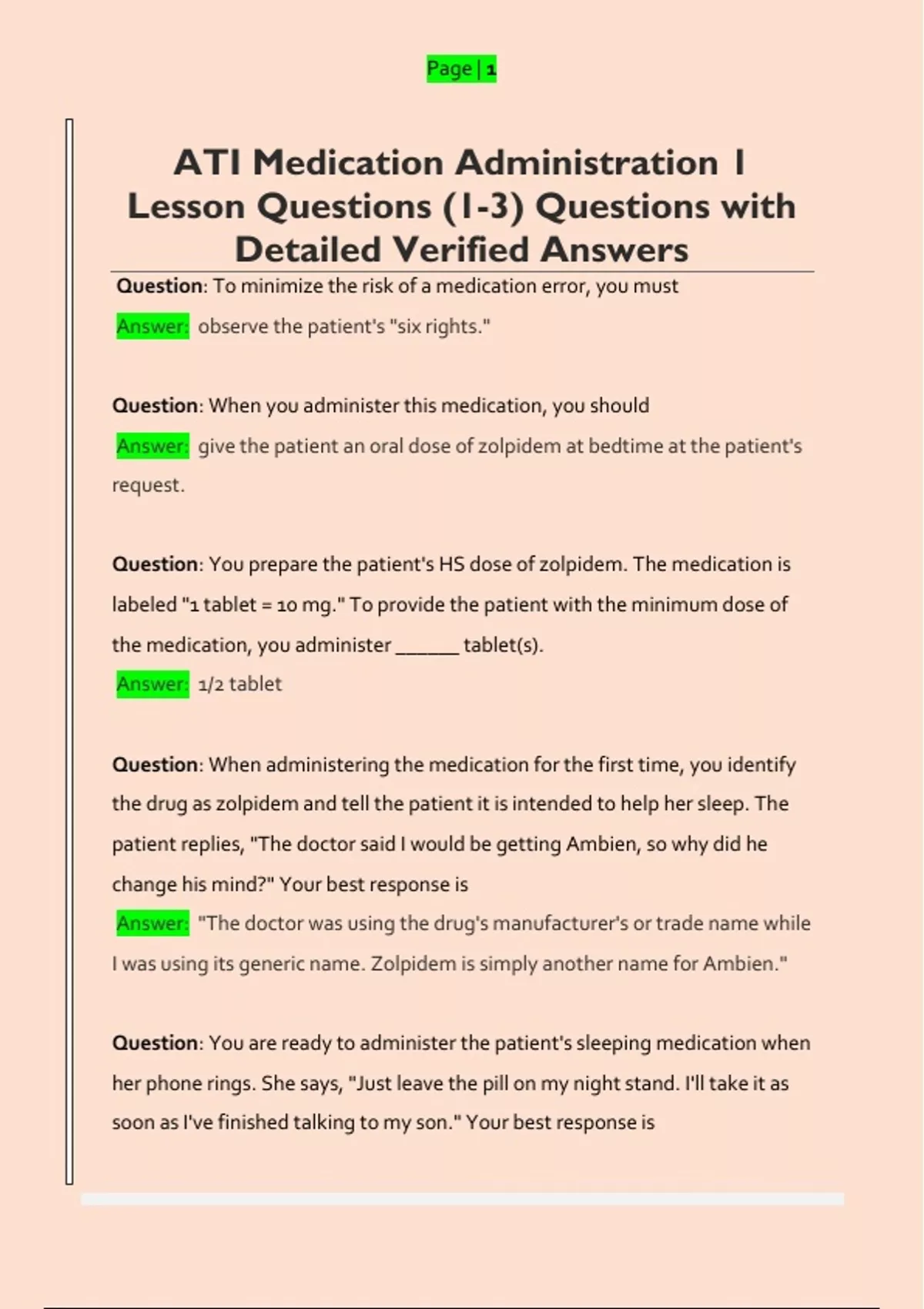 ATI Medication Administration 1 Lesson Questions (1-3) Questions with Detailed Verified Answers