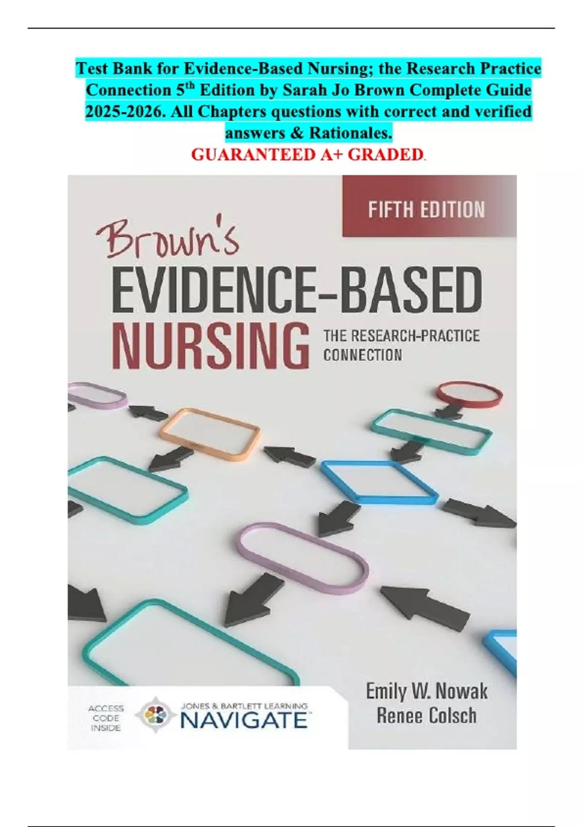Test Bank for Evidence-Based Nursing; the Research Practice Connection 5th Edition by Sarah Jo Brown Complete Guide . All Chapters questions with correct and verified answers & Rationales. GUARANTEED A+ GRADED. Chapter 1 The Research-Practice Connection MULTIPLE CHOICE • Which best describes evidence-based-practice (EBP)? a.A combination of best research evidence, clinical expertise, and the needs and values of clients. b.A determination of the factors necessary to control client responses to care. c.The development of population care guidelines applicable to all clients. d.The utilization of quantitative and qualitative studies to enhance client outcomes. CORRECT A