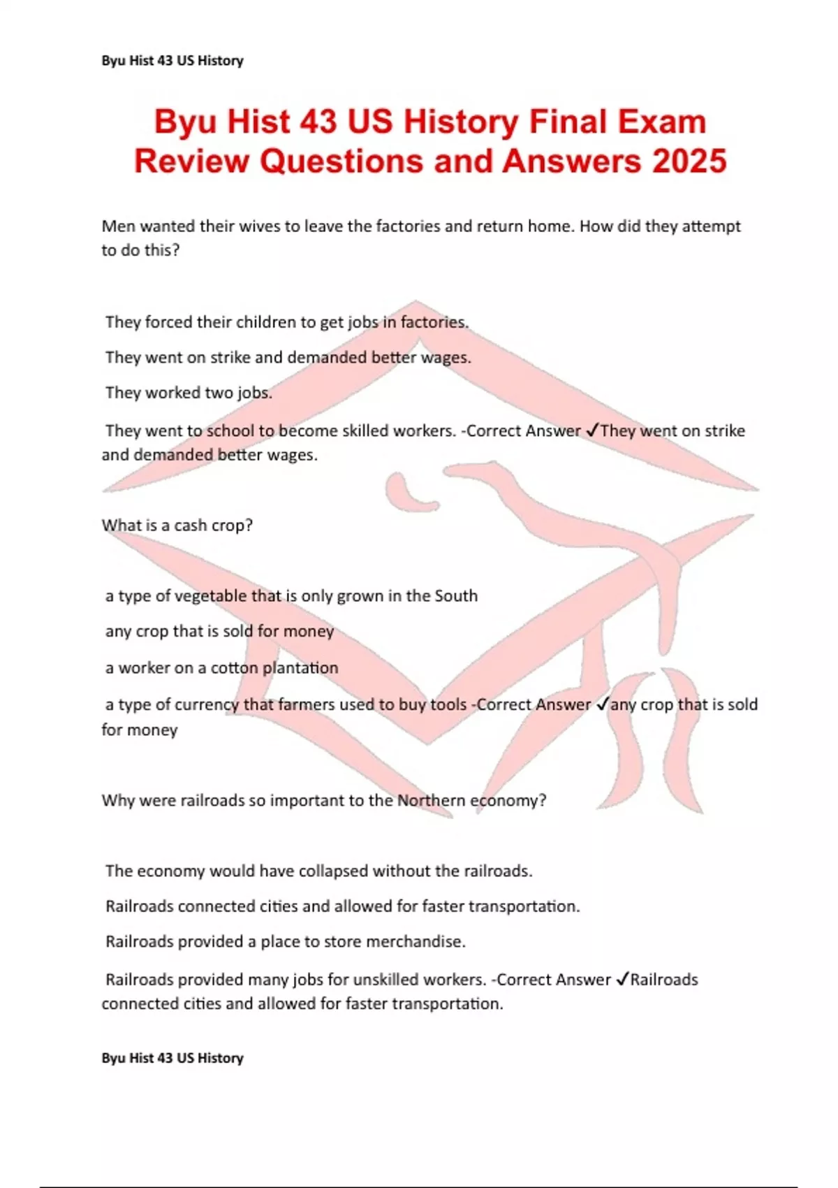 Byu Hist 43 US History Final Exam Review Questions and Answers 2025