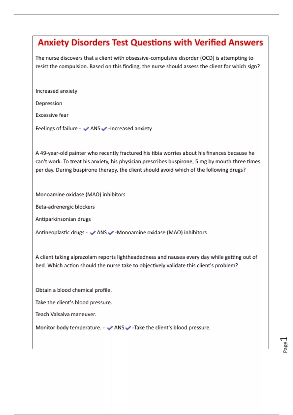 Anxiety Disorders Test Questions with Verified Answers The nurse discovers that a client with obsessive-compulsive disorder (OCD) is attempting to resist the compulsion. Based on this finding, the nurse should assess the client for which sign? Increased anxiety Depression Excessive fear Feelings of failure - ANS -Increased anxiety A 49-year-old painter who recently fractured his tibia worries about his finances because he can't work. To treat his anxiety, his physician prescribes buspirone, 5 mg by mouth three times per day. During buspirone therapy, the client should avoid which of the following drugs? Monoamine oxidase (MAO) inhibitors Beta-adrenergic blockers Antiparkinson