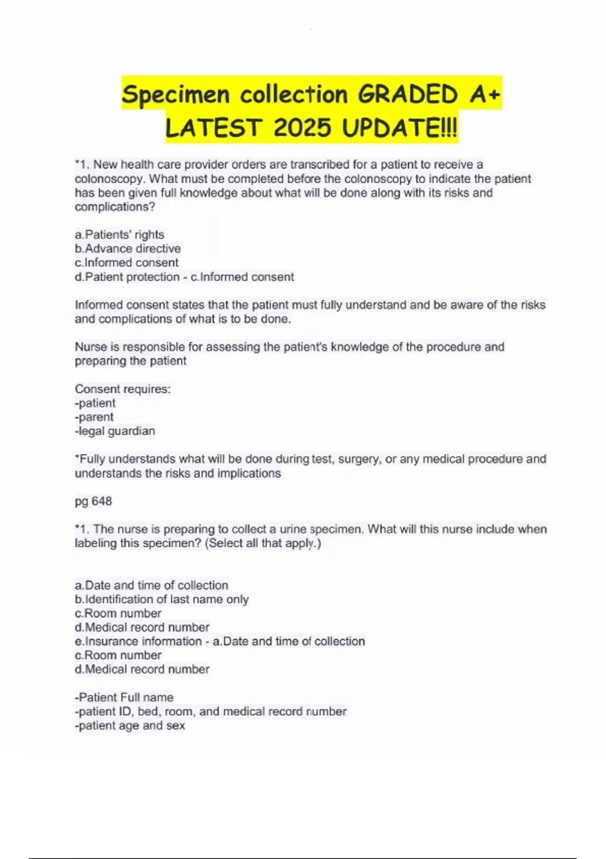 Specimen collection GRADED A+ LATEST 2025 UPDATE!!