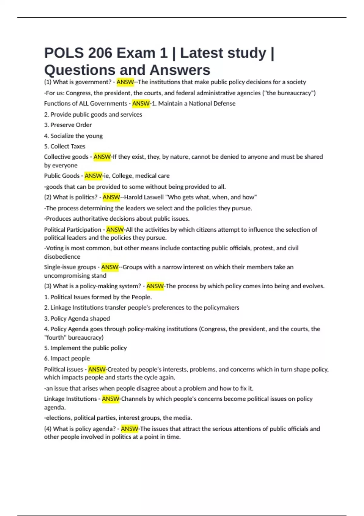 (1) What is government? - ANSW--The institutions that make public policy decisions for a society