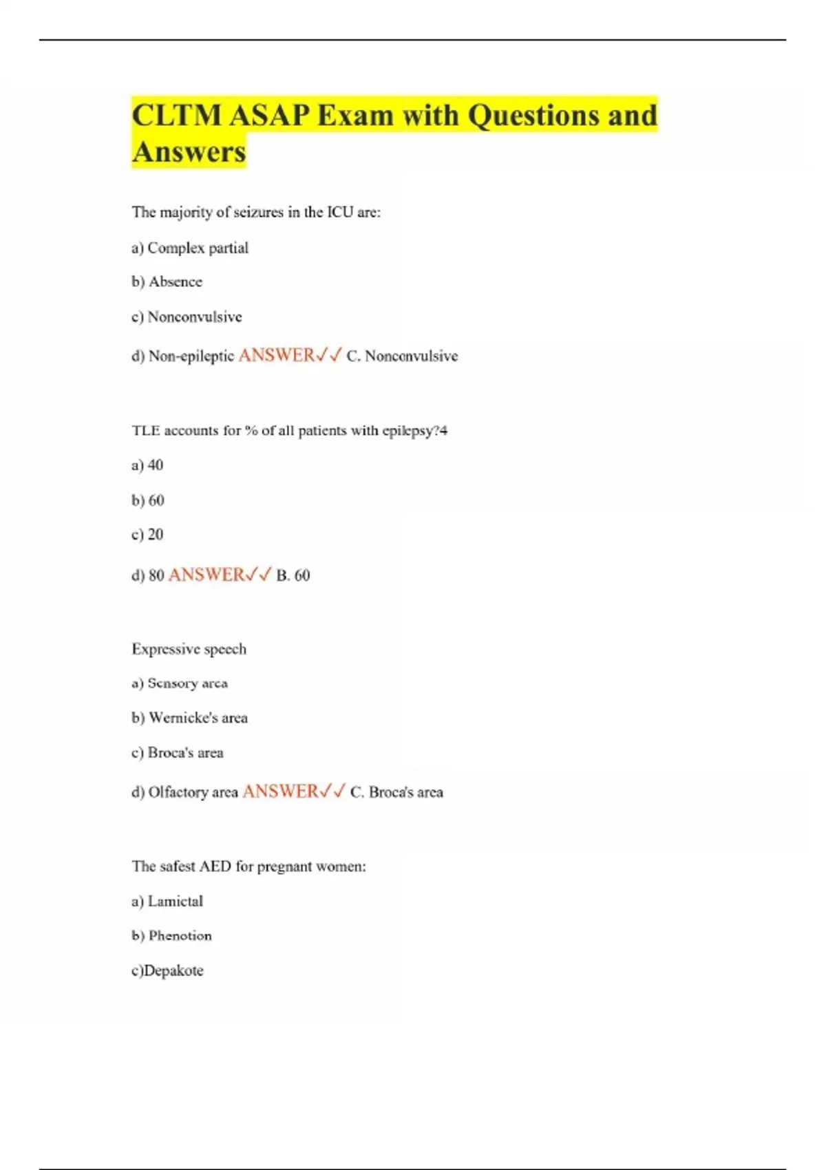 CLTM ASAP Exam with Questions and Answers The majority of seizures in the ICU are: a) Complex partial b) Absence c) Nonconvulsive d) Non-epileptic ANSWER C. Nonconvulsive TLE accounts for % of all patients with epilepsy?4 a) 40 b) 60 c) 20 d) 80 ANSWER B. 60 Expressive speech a) Sensory area b) Wernicke's area c) Broca's area d) Olfactory area ANSWER C. Broca's area The safest AED for pregnant women: a) Lamictal b) Phenotion c)Depakote