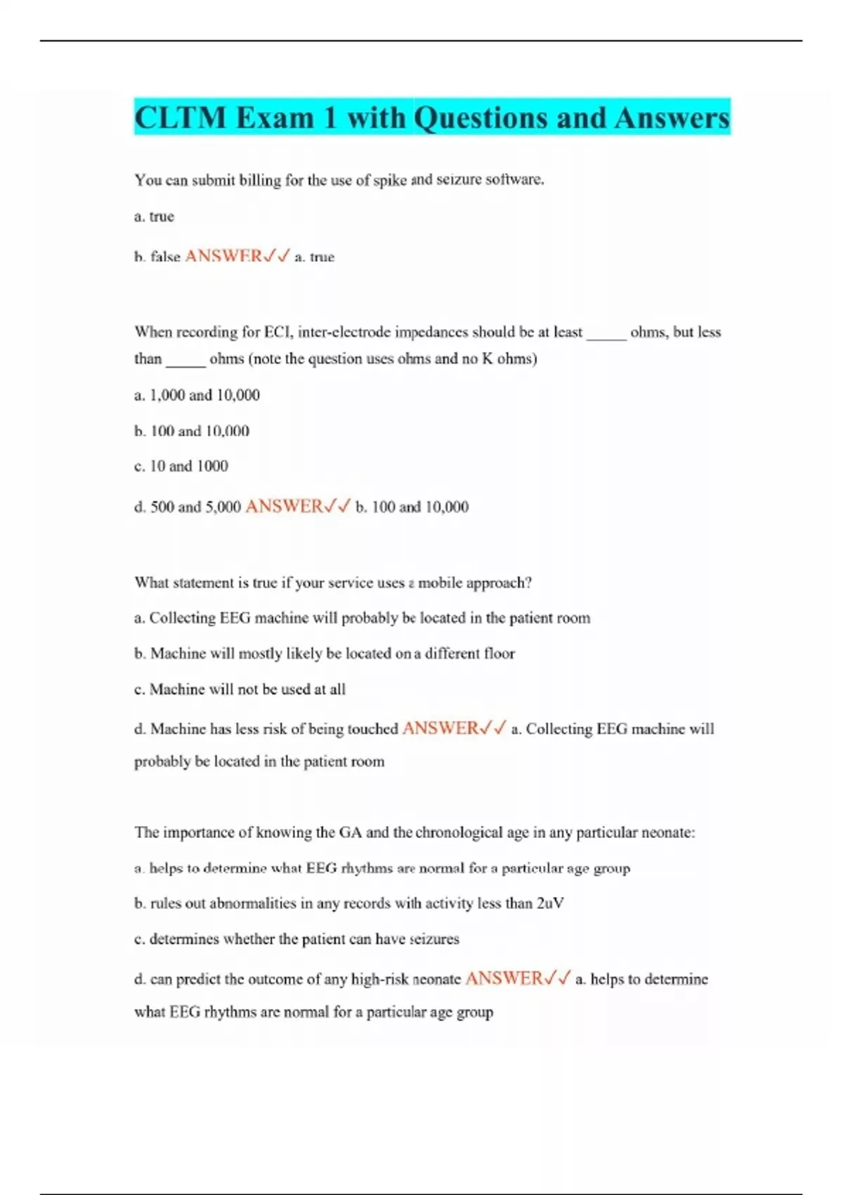 CLTM Exam 1 with Questions and Answers You can submit billing for the use of spike and seizure software. a. true b. false ANSWER a. true When recording for ECI, inter-electrode impedances should be at least _____ ohms, but less than _____ ohms (note the question uses ohms and no K ohms) a. 1,000 and 10,000 b. 100 and 10,000 c. 10 and 1000 d. 500 and 5,000 ANSWER b. 100 and 10,000 What statement is true if your service uses a mobile approach? a. Collecting EEG machine will probably be located in the patient room b. Machine will mostly likely be located on a different floor c. Machine will not be used at all d. Machine has less risk of being touched ANSWER a. Collecting EEG machine will probably be located in the patient room The importance of knowing the GA and the chronological age in any particular neonate: a. helps to determine what EEG rhythms are normal for a particular age group b. rules out abnormalities in any records with activity less than 2uV c. determines whether the patient can have seizures d. can predict the outcome of any high-risk neonate ANSWER a. helps to determine what EEG rhythms are normal for a particular age group