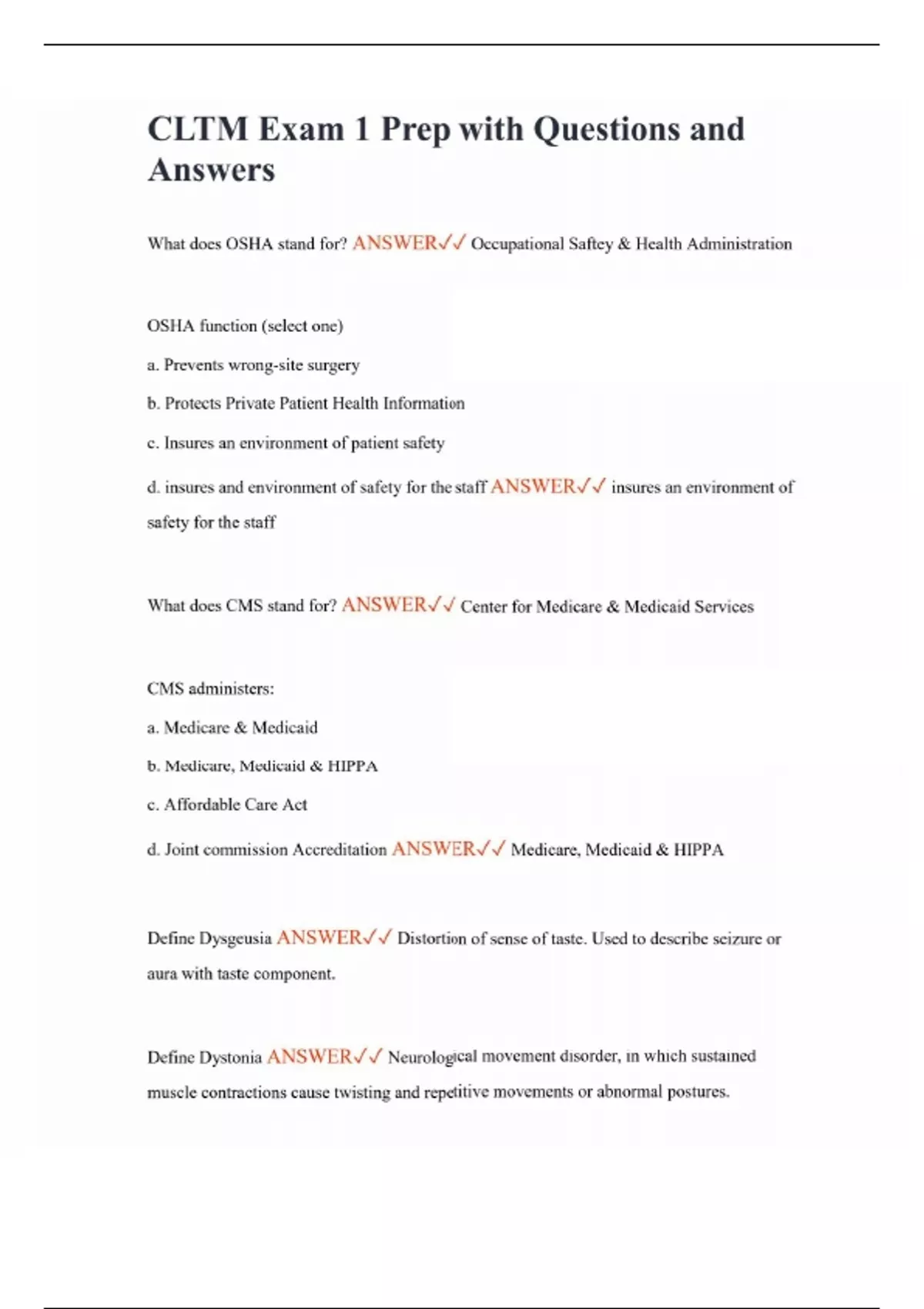 CLTM Exam 1 Prep with Questions and Answers What does OSHA stand for? ANSWER Occupational Saftey & Health Administration OSHA function (select one) a. Prevents wrong-site surgery b. Protects Private Patient Health Information c. Insures an environment of patient safety d. insures and environment of safety for the staff ANSWER insures an environment of safety for the staff What does CMS stand for? ANSWER Center for Medicare & Medicaid Services CMS administers: a. Medicare & Medicaid b. Medicare, Medicaid & HIPPA c. Affordable Care Act d. Joint commission Accreditation ANSWER Medicare, Medicaid & HIPPA Define Dysgeusia ANSWER Distortion of sense of taste. Used to describe seizure or aura with taste component. Define Dystonia ANSWER Neurological movement disorder, in which sustained muscle contractions cause twisting and repetitive movements or abnormal postures.