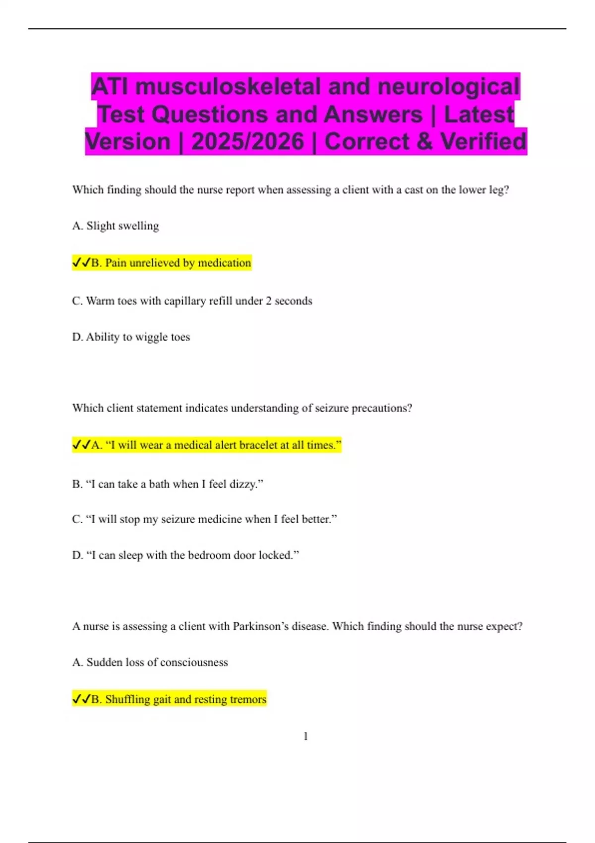 ATI musculoskeletal and neurological Test Questions and Answers | Latest Version | 2025/2026 | Correct & Verified Which finding should the nurse report when assessing a client with a cast on the lower leg? A. Slight swelling B. Pain unrelieved by medication C. Warm toes with capillary refill under 2 seconds D. Ability to wiggle toes Which client statement indicates understanding of seizure precautions? A. “I will wear a medical alert bracelet at all times.” B. “I can take a bath when I feel dizzy.” C. “I will stop my seizure medicine when I feel better.” D. “I can sleep with the bedroom door locked.” A nurse is assessing a client with Parkinson’s disease. Which finding should the nurse expect? A. Sudden loss of consciousness B. Shuffling gait and resting tremors 2 C. Flaccid muscles and no deep tendon reflexes D. Involuntary jerking of the limbs Which action should the nurse take when assisting a client with osteoporosis? A. Encourage weight-bearing exercises B. Limit calcium intake C. Use soft, cushioned slippers for walking D. Instruct the client to avoid all physical activity A client with a spinal cord injury reports a pounding headache and high blood pressure. What is the priority action? A. Call the provider immediately B. Check for bladder distension and relieve it C. Administer oral pain medication D. Lower the head of the bed A nurse is caring for a client who had a stroke affecting the left hemisphere. Which deficit is most likely? 3 A. Speech and language impairment B. Poor impulse control C. Left-sided neglect D. Increased spatial awareness Which intervention is appropriate for a client in skeletal traction? A. Remove the weights for repositioning B. Ensure weights hang freely and are not on the floor C. Massage the area under the pins daily D. Raise the head of the bed to 90 degrees Which client behavior indicates understanding of home safety with a new walker? A. “I will move the walker forward, then step into it.” B. “I will carry it while walking across the room.” C. “I will use it only when I feel tired.” D. “I will lean backward when using it for balance.” What is the priority nursing action after a lumbar puncture? 4 A. Encourage coughing and deep breathing B. Apply heat to the injection site C. Have the client lie flat for several hours