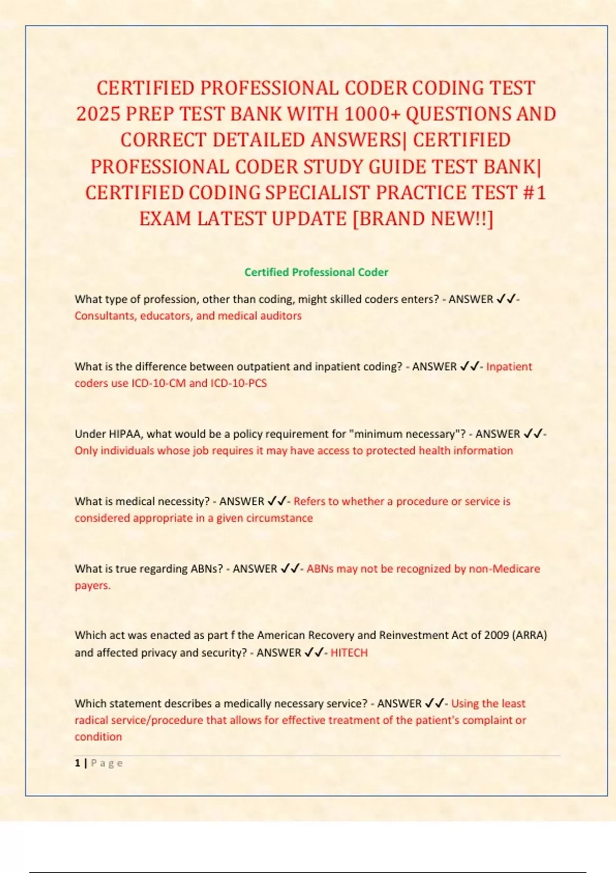 CERTIFIED PROFESSIONAL CODER CODING TEST 2025 PREP TEST BANK WITH 1000+ QUESTIONS AND CORRECT DETAILED ANSWERS| CERTIFIED PROFESSIONAL CODER STUDY GUIDE TEST BANK| CERTIFIED CODING SPECIALIST PRACTICE TEST #1 EXAM LATEST UPDATE [BRAND NEW!!]